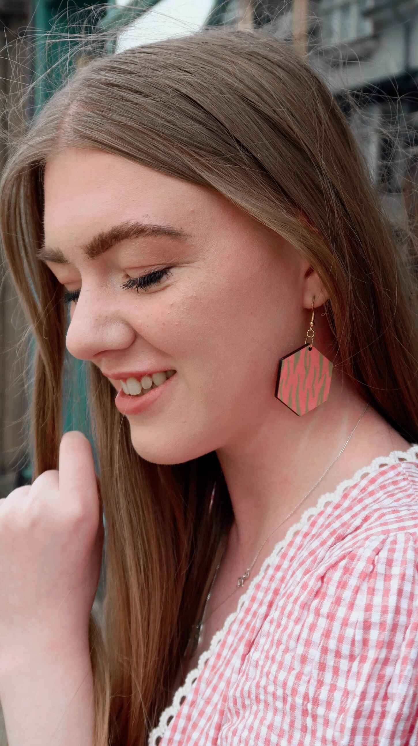 The tiger print earrings feature a pink base with gold stripes and gold hardware. These are the only hexagonal pair in the collection and certainly make a statement!
