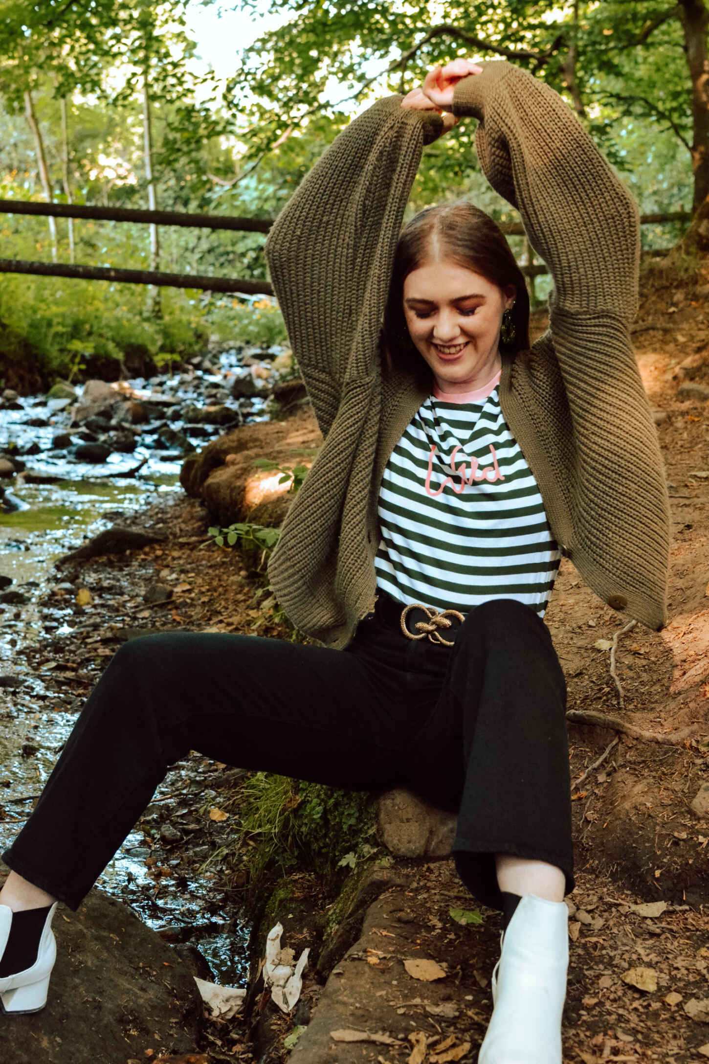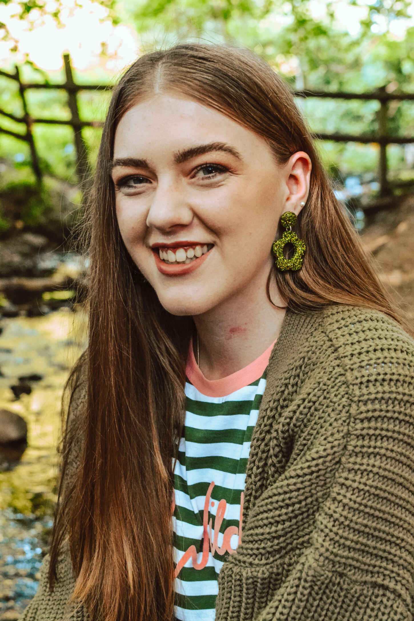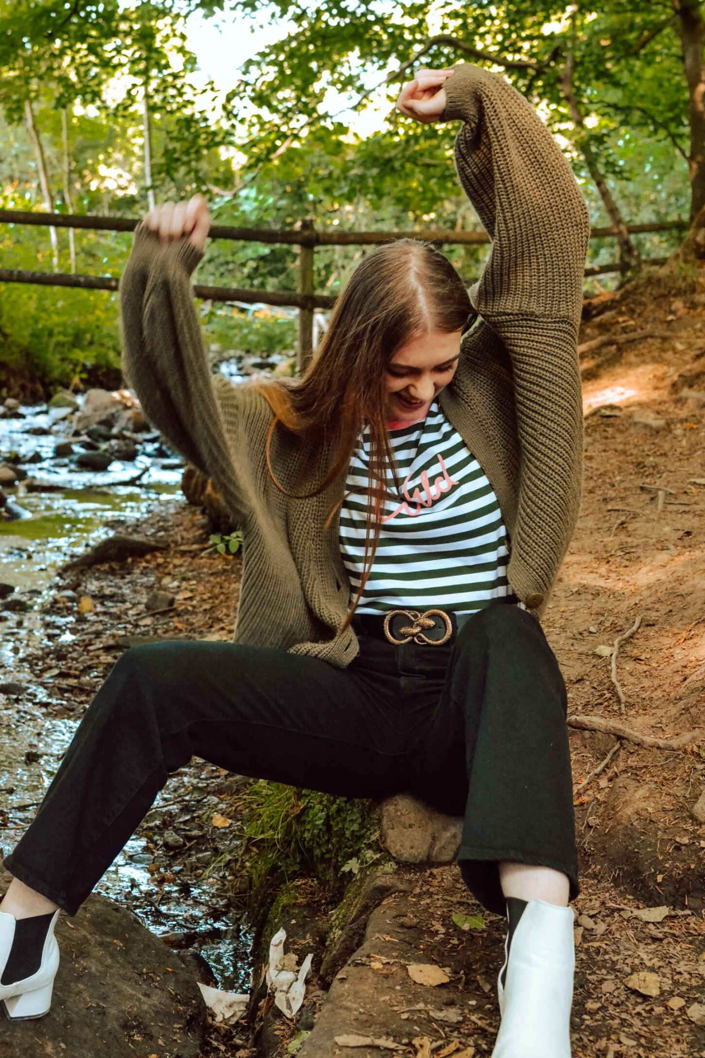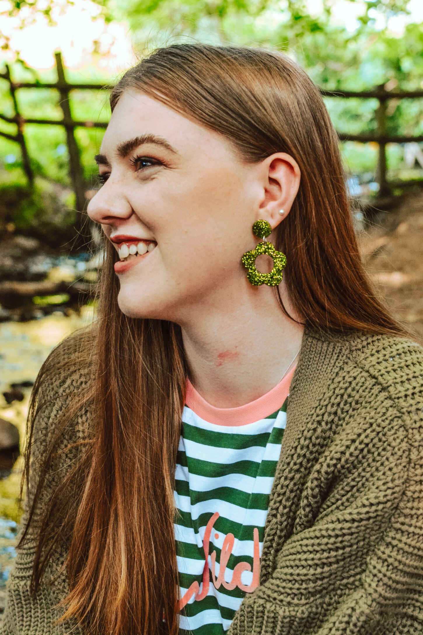I wore the outfit with my olive coloured cardigan from Boohoo. It complements the green in the tee, and the balloon sleeves are my favourite to wear. I tied the top half of the outfit together with these From The Ether* custom flower-shaped earrings, which are in the most incredible olive glitter. From The Ether is a Staffordshire based brand creating a selection of funky resin earrings in an array of colours.