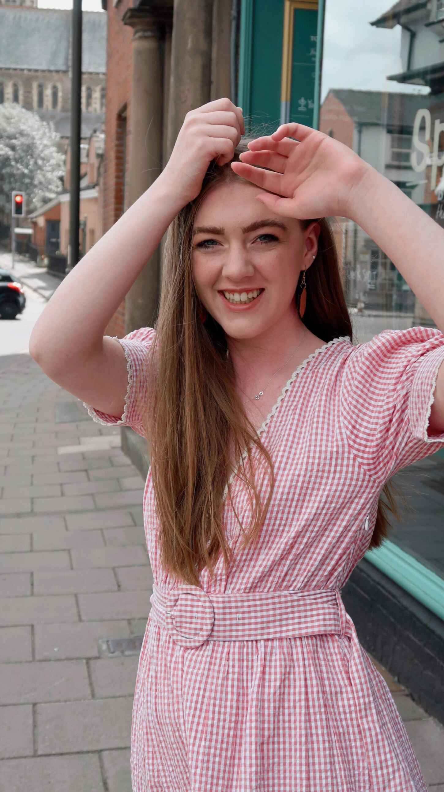 I wore this with white ankle socks with a gingham frill with Paradox London* pearl and diamante trainers. To accessorise, I’m wearing my Ivy&Ginger x beffshuff pink and old tiger print earrings*. All I was missing was a little gingham scrunchie to make me feel like I was back at primary school.
