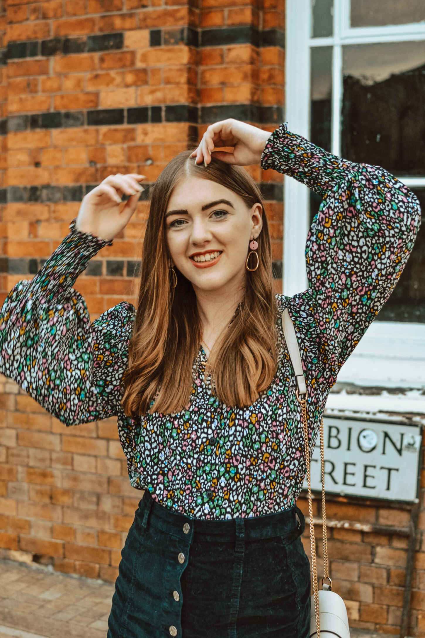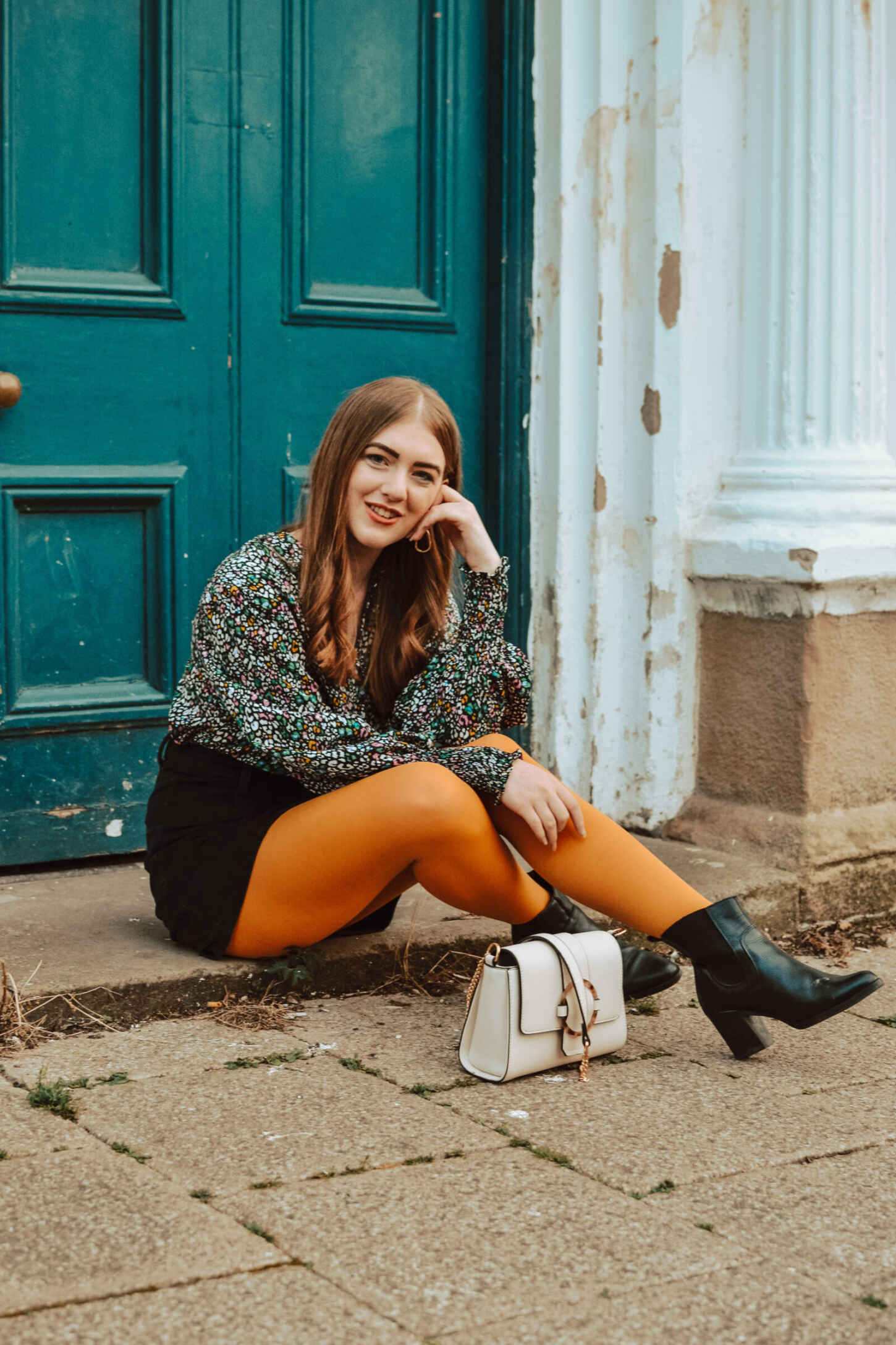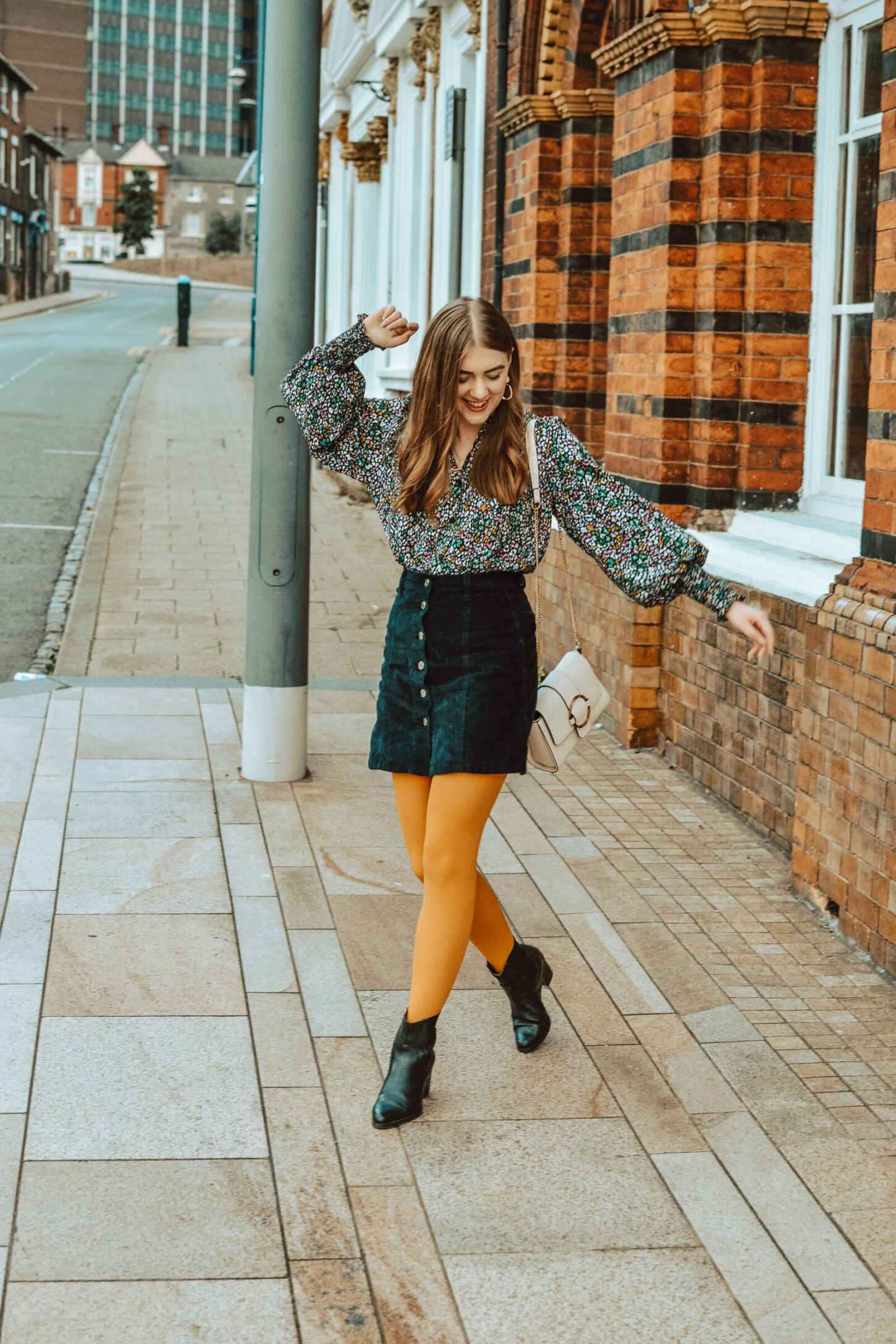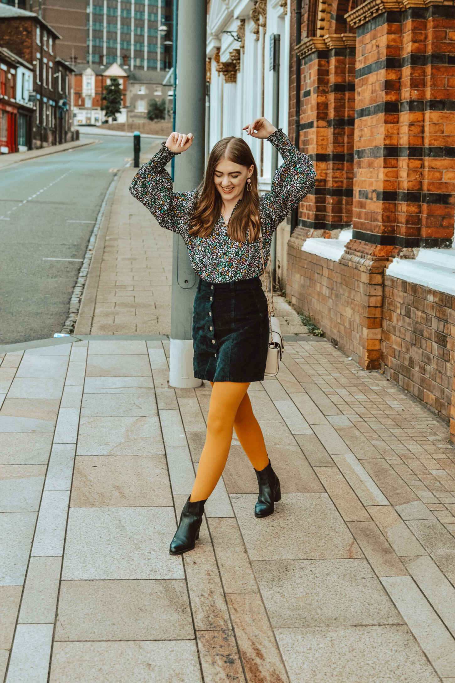 I wore my mustard Better Tights with a 70s corduroy a-line skirt and heeled leather Wrangler boots. I paired them with this Topshop leopard print multi-coloured blouse, which I bagged for £8 in the sale. Sporting mustard, pink, green and blue shades in the blouse, I could have worn any colour of Better Tights. I think mustard is a gorgeous shade for transitioning from summer to autumn. Plus, it pairs well with other pieces in my wardrobe too. To accessories, I’m wearing Staffordshire-based Cloud and Clay’s Rose earrings, and my Dorothy Perkins cream cross-body bag.