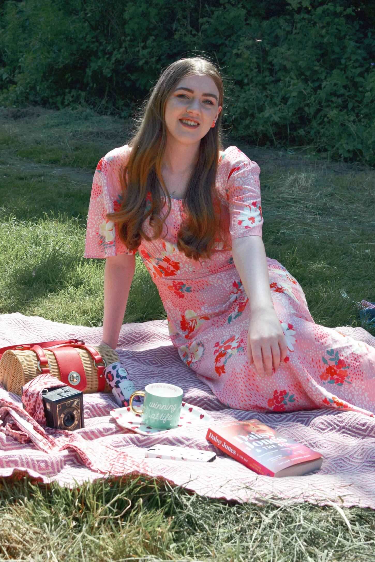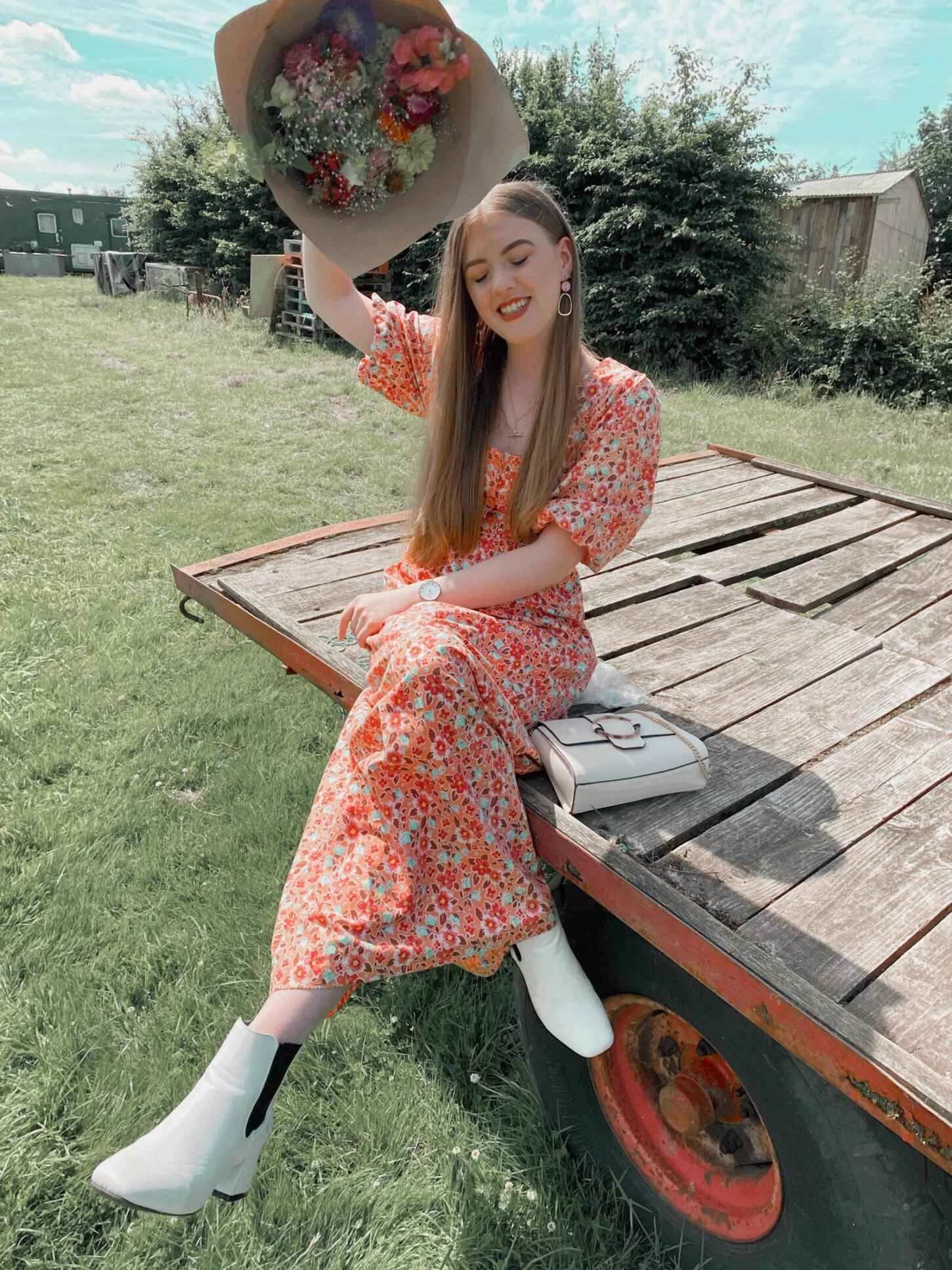I wore this dress to go strawberry picking in, and I’m so in love with the floral pattern with bursts of colour, drop neckline and puffed sleeves.