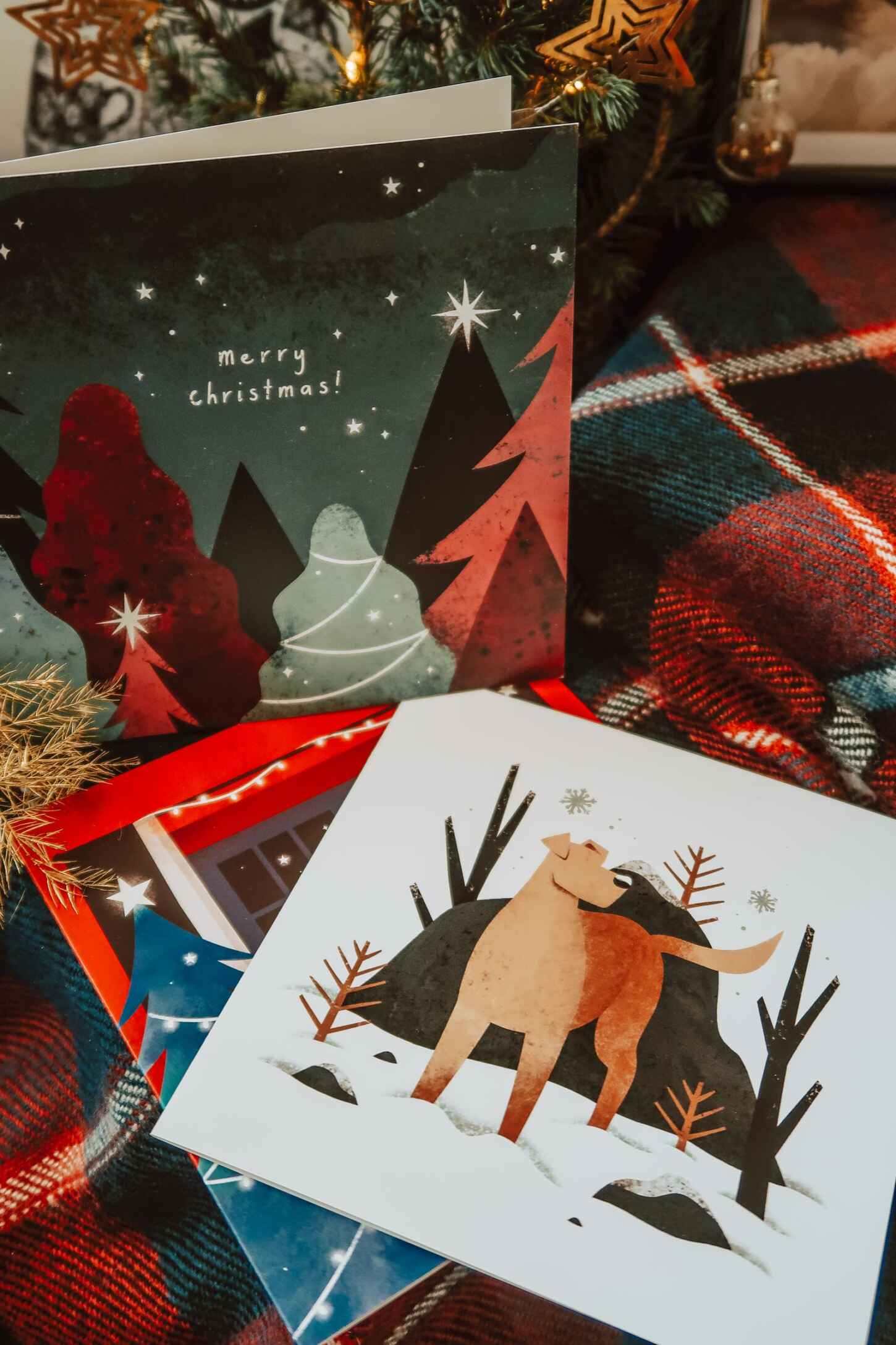Some of the designs include a fox terrier in the snow, a cat snoozing near a Christmas tree, and a festive spruce scene with the words Merry Christmas, priced at £3.30 each. You can order a pack of six for £12, making them just £2 each.