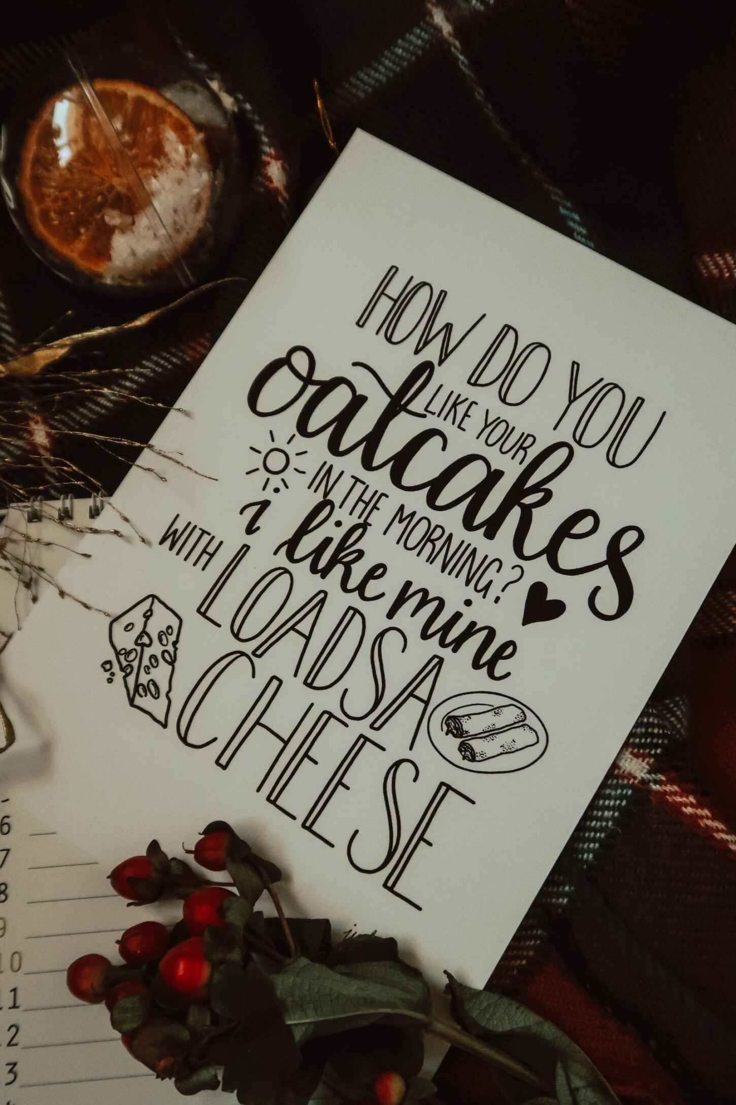 The final print reads ‘How do you like your oatcakes in the morning? I like mine with loadsa cheese’ If it were in potteries dialect, it would say ‘Ow d’yer lark yer owtcaykes in the moanin? I lark moin with loadsa chayse’ – but that would be pretty difficult to read, so we love Storm’s version best! It looks great with the ‘Kettle On’ print, and would make a fab kitchen duo.