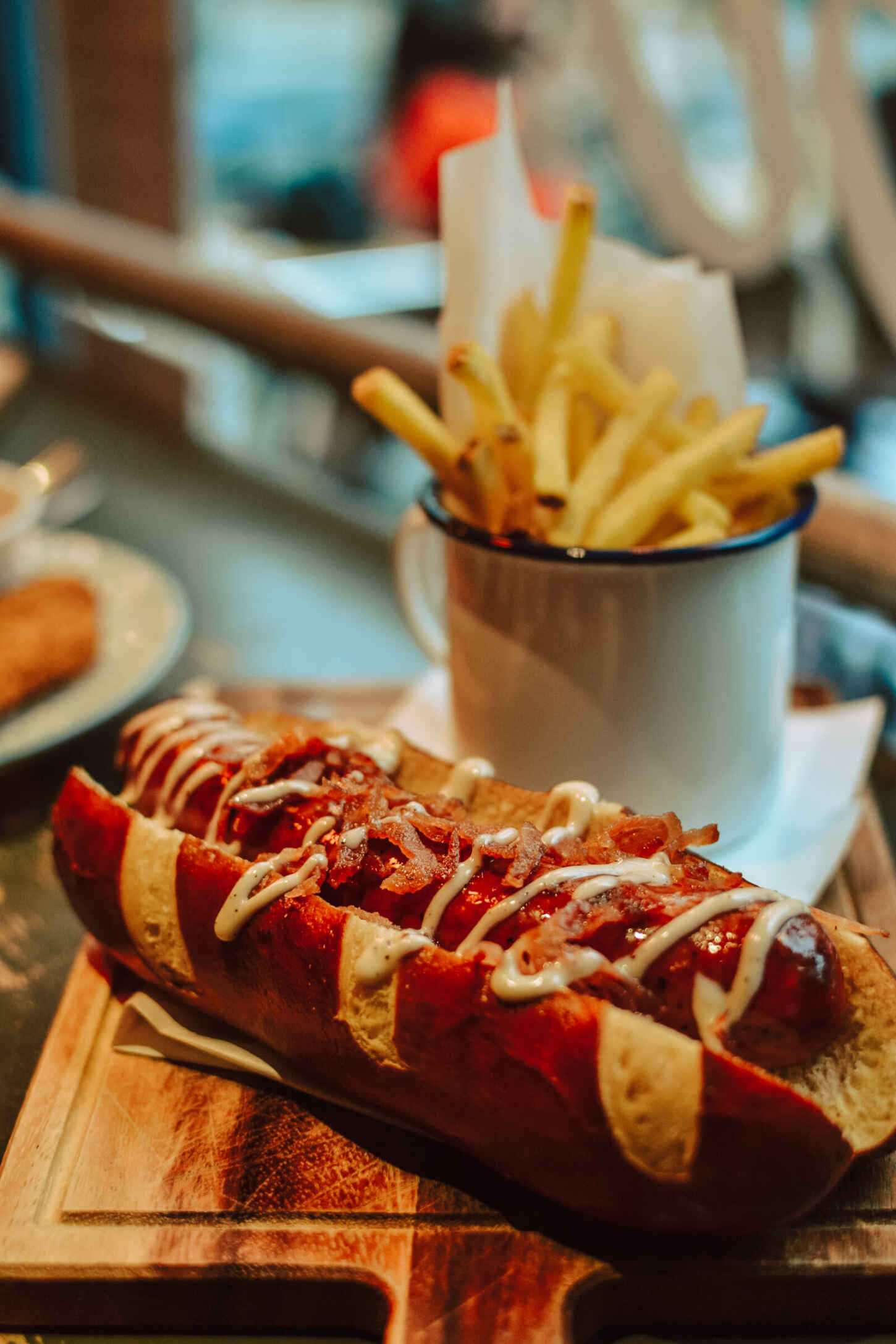 During Eat Out to Help Out, Jake and I took a trip into the city centre and pulled up a seat at the window, where I ordered the bacon and blue dog. I still drool just thinking about it. Wild boar and pork sausage, crispy bacon bits and blue cheese dressing served in a gorgeous pretzel bun with fries. We also ordered mozzarella dippers and mac and cheese bites to share, because we’re both cheese obsessed.