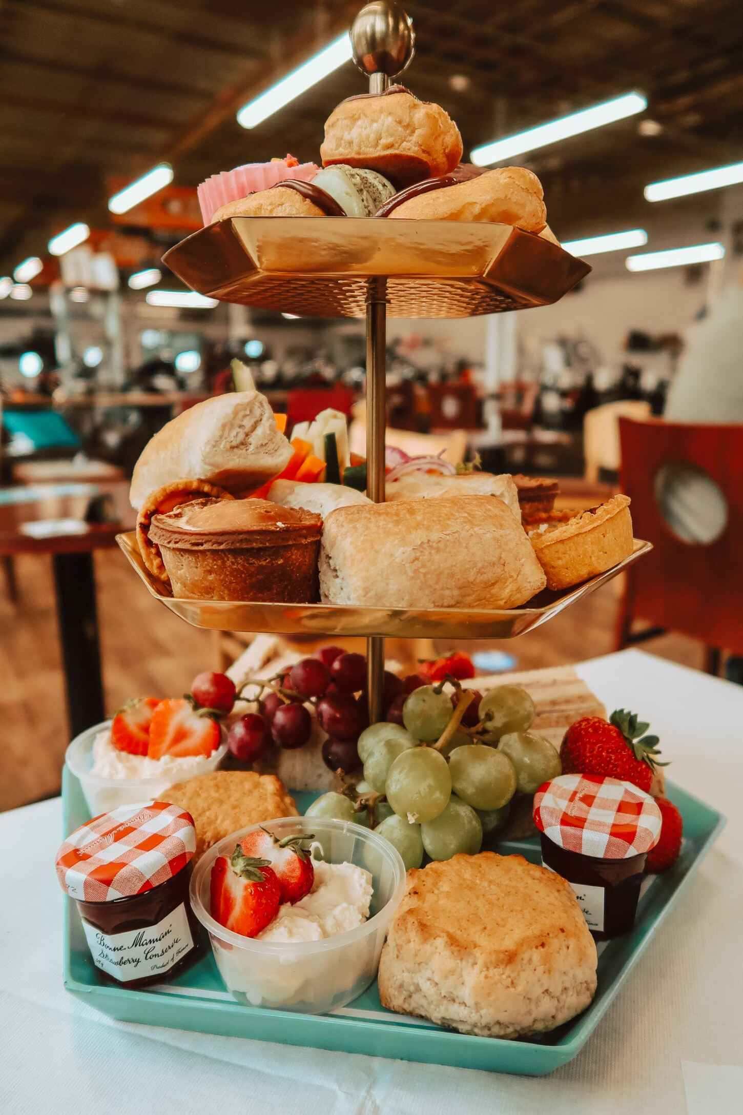 We enjoyed an Afternoon Tea which included a selection of cupcakes, chocolate eclairs, macaroons, sausage rolls, mini quiches, pork pies and finger sandwiches, as well as scones with jam and cream, and a selection of fruit. There was so much food packed onto the stand you couldn’t see the bottom, and we ended up taking quite a bit of it home! The sausage rolls and macaroons were absolutely the highlight.