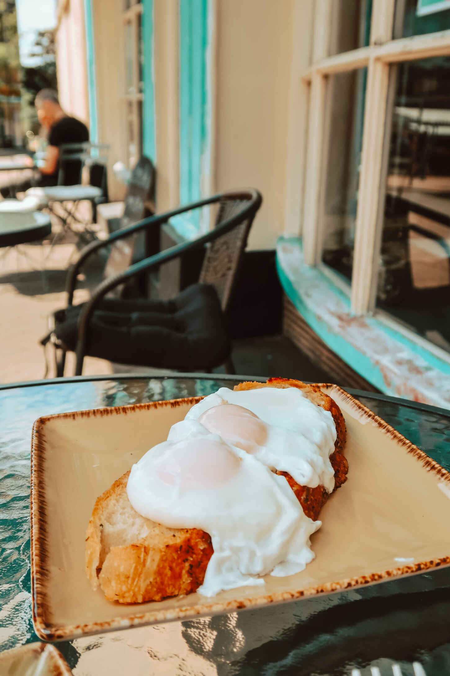 I headed down on a sunny Saturday afternoon for a solo-brunch date and managed to get a table outside. In hindsight, I wish I’d called ahead to book a table, as I’d have preferred to sit inside, but there are four two seater tables under a small canopy in the sun, overlooking the cute little floral courtyard that the Business Improvement District have installed.