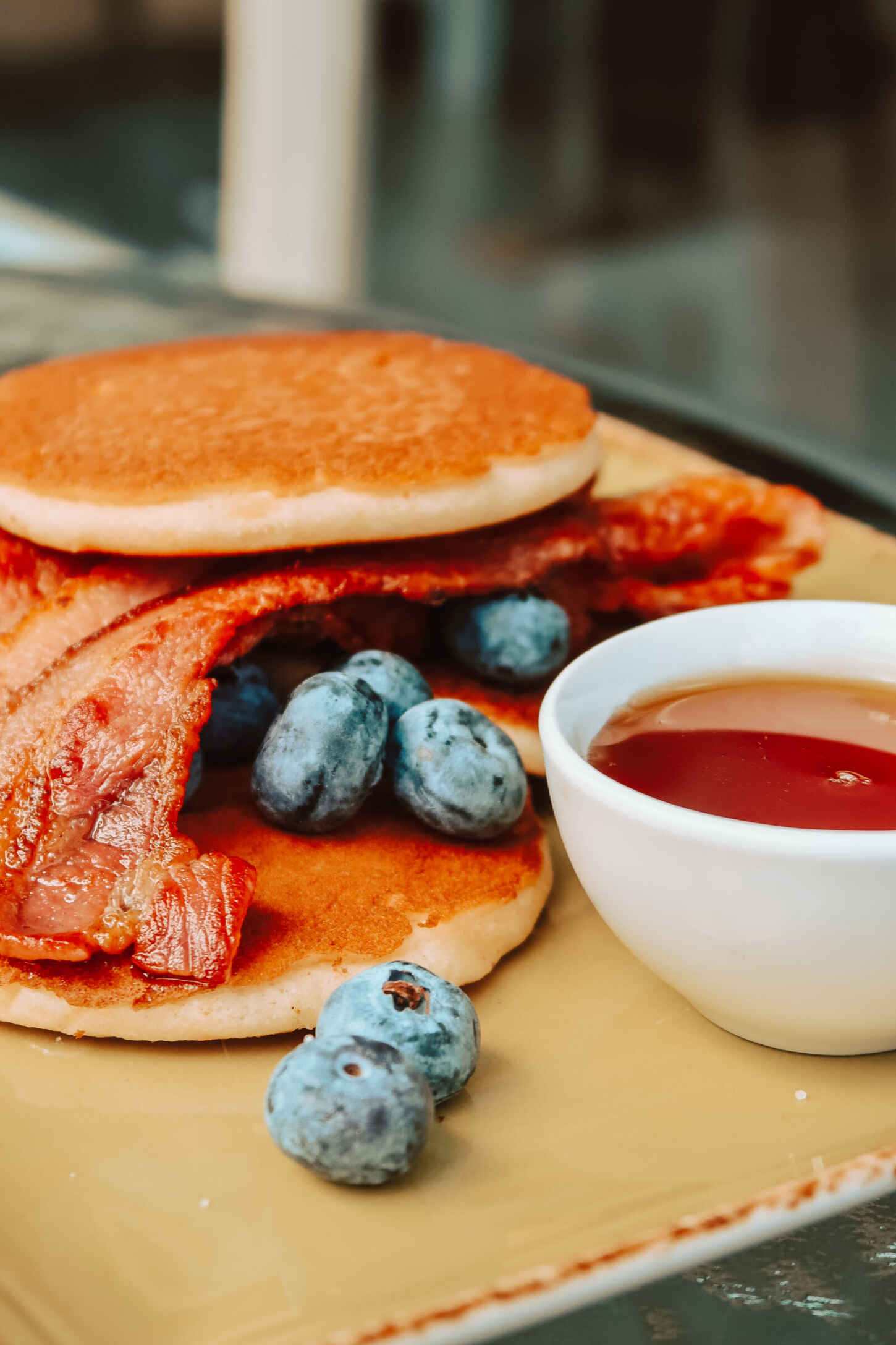 Staring at the brunch options, I was entirely undecided, so ordered not one, but two plates. I opted for the poached egg on toasted focaccia – sans avocado – as well as the buttermilk pancakes, and a side of fries for good measure.