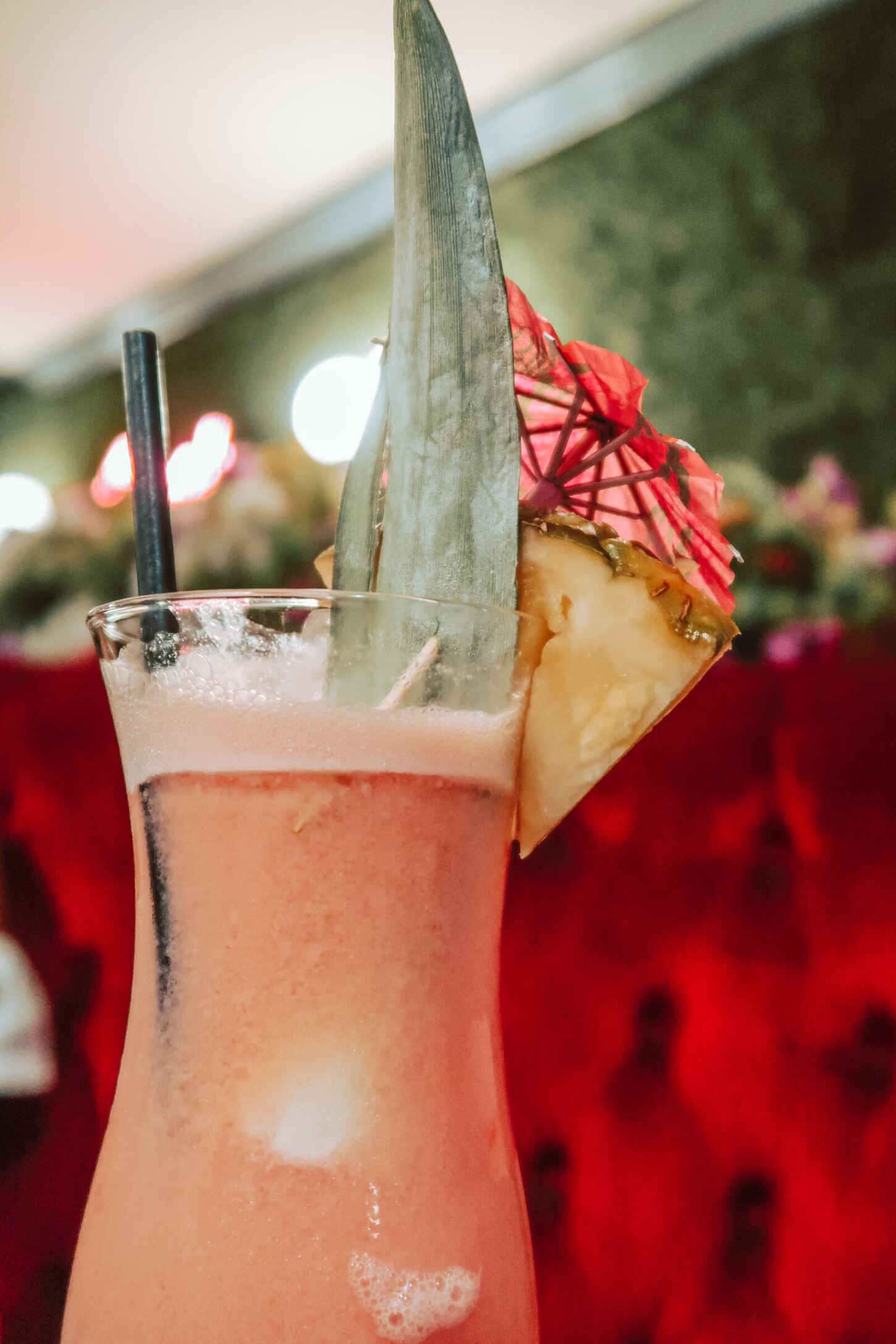 - Strawberry Banana, Pina Colada – Malibu, banana liqueur, strawberry liqueur, coconut syrup, pineapple juice, cream of coconut and strawberry syrup, garnished with strawberry and orange.