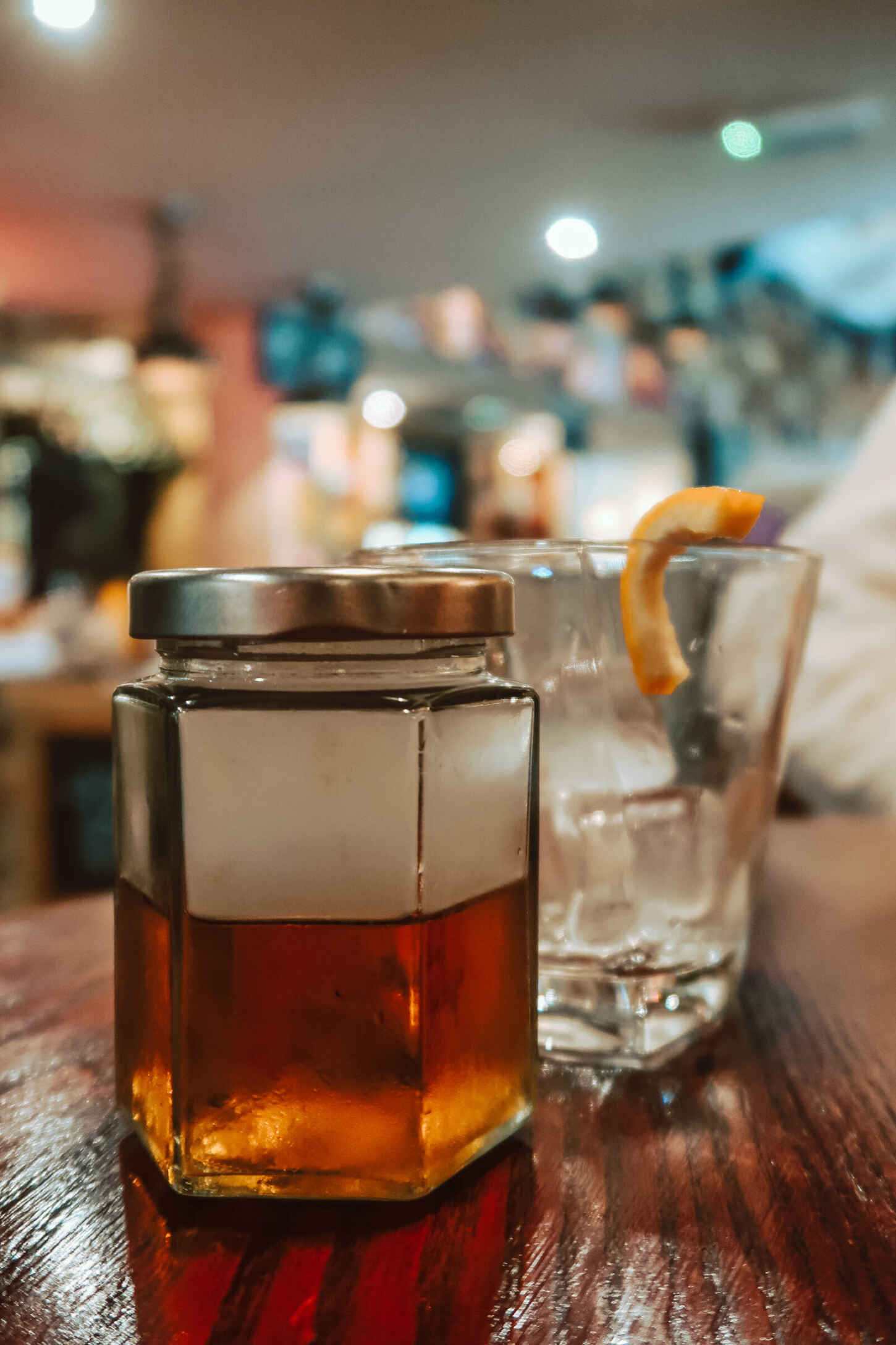 - Smokey Maple Old Fashioned – Woodford reserve bourbon, maple syrup, orange bitters in a jar with smoked Maplewood, garnished with orange peel.