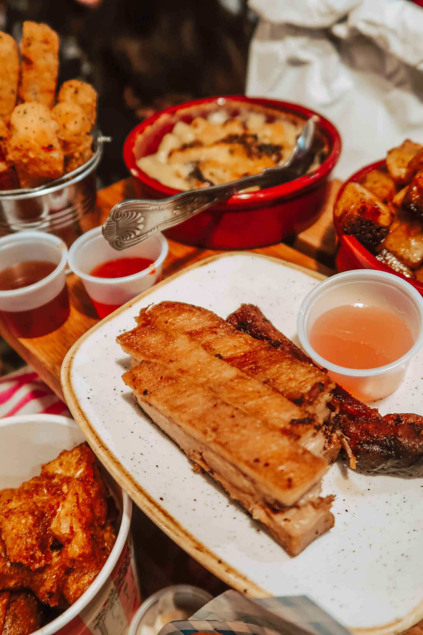 The food came delivered on a picnic bench, and we were given Staffordshire Churchill China plates to dish our meals onto. Our server took the time to let us know what each dish was on our bench, including the food that was wrapped up in pick ‘n’ mix bags to conserve heat. We passed each of the dishes round and served ourselves, going in for seconds once everyone had their fill.