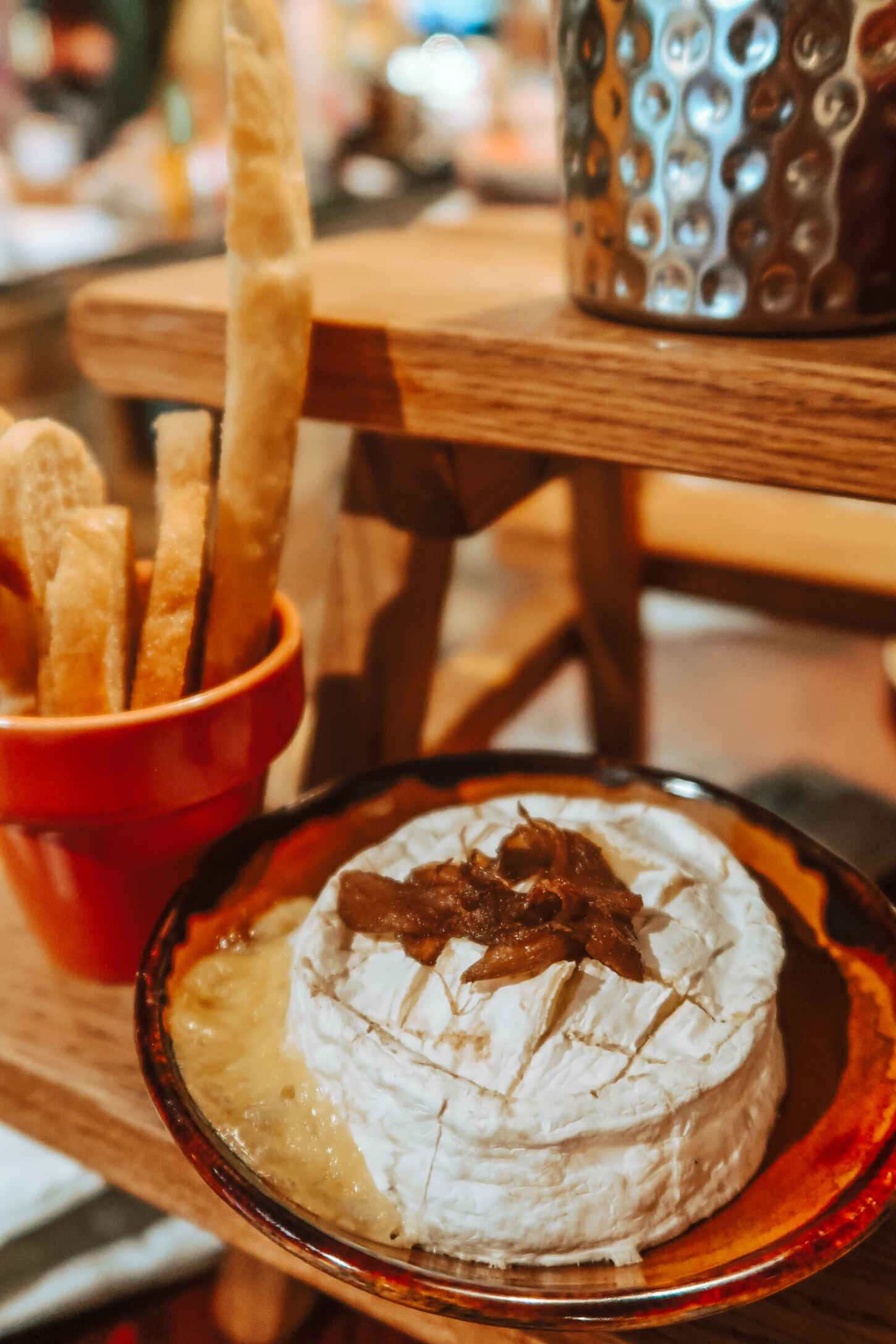 - Baked Camembert with caramelised onions, melba toast – £6.00 V