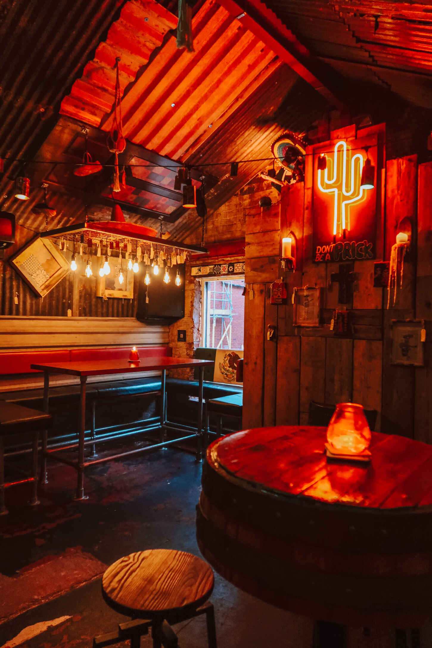 Inside, the dimly lit venue has sugar skull and tequila murals painted by The Mural Masters, with neon cactus lights and industrial bulbs lighting corners of the room. Above, Havana Club rum tins house illuminated bulbs – look closer, and you’ll find trainers dotted around the ceiling. What might seem like a bizarre decor choice is actually based on legends that suggest the shoes mark the location of gang territory, synonymous with Mexican drug rings.