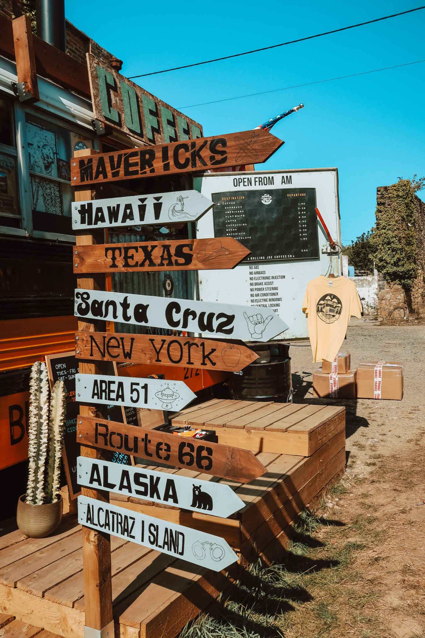 As you roll up to the pitstop, you can pull your car into a little sparking spot inside some building ruins before heading past the American mailbox and up to the hatch to order. A stars and stripes flag hangs from the roof of the bus, with the steps leading into the vehicle adorned with imported number plates. Stood outside this bus, you feel as though you could be anywhere in the world.