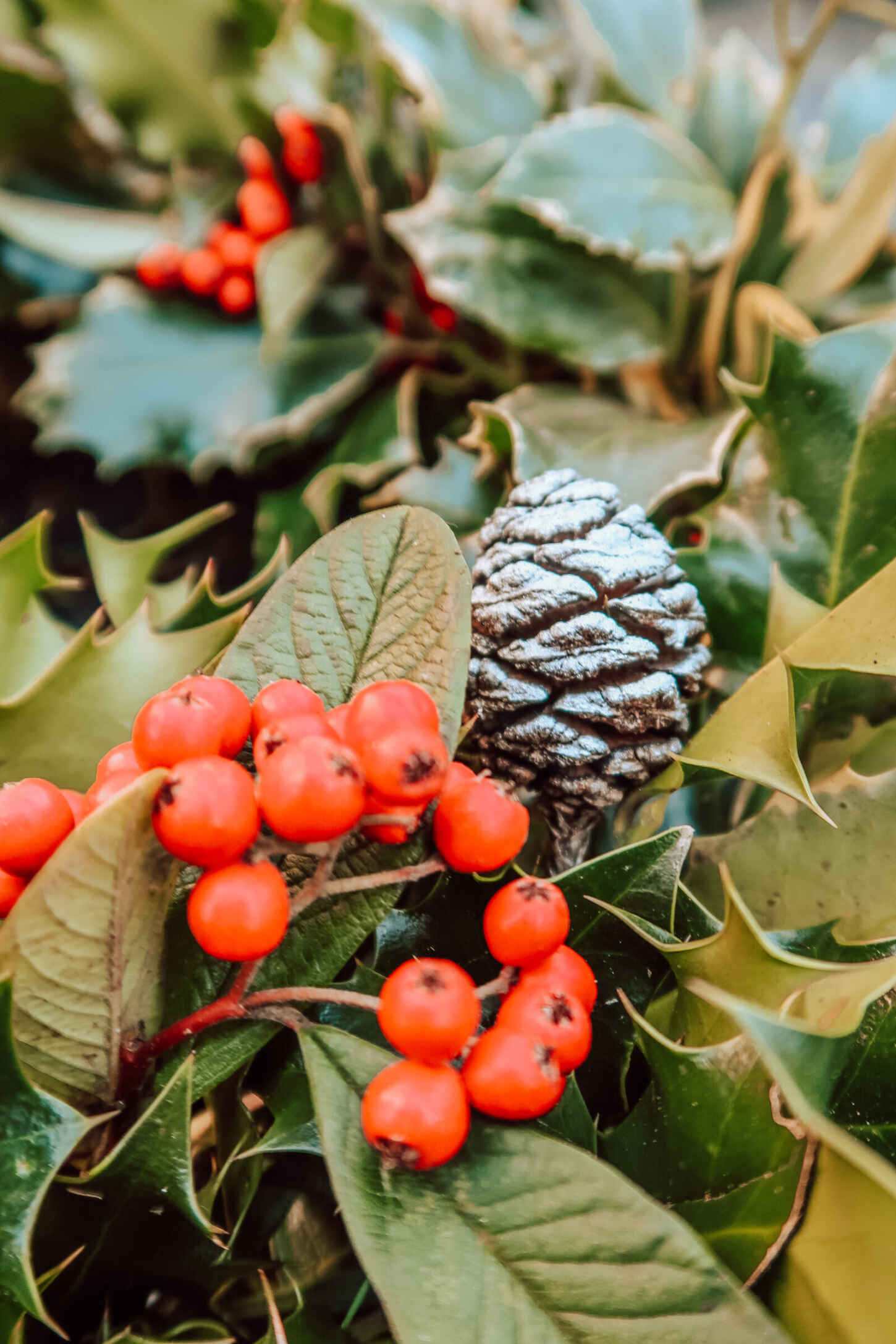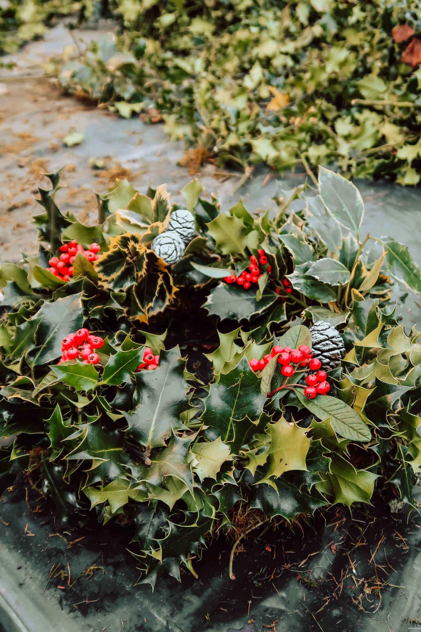 With the moss securely wired on, we could start building our wreath with the different kinds of holly, all grown in the gardens – from black holly, to variegated versions, too. We learned how to stack two stems together and wire them onto the wreath to build a nice full, round shape, with very few gaps. However, if you are thinking of heading to a wreath workshop that works with holly, I highly recommend taking some gloves with you, or you’ll have sore thumbs and fingers for a few days.