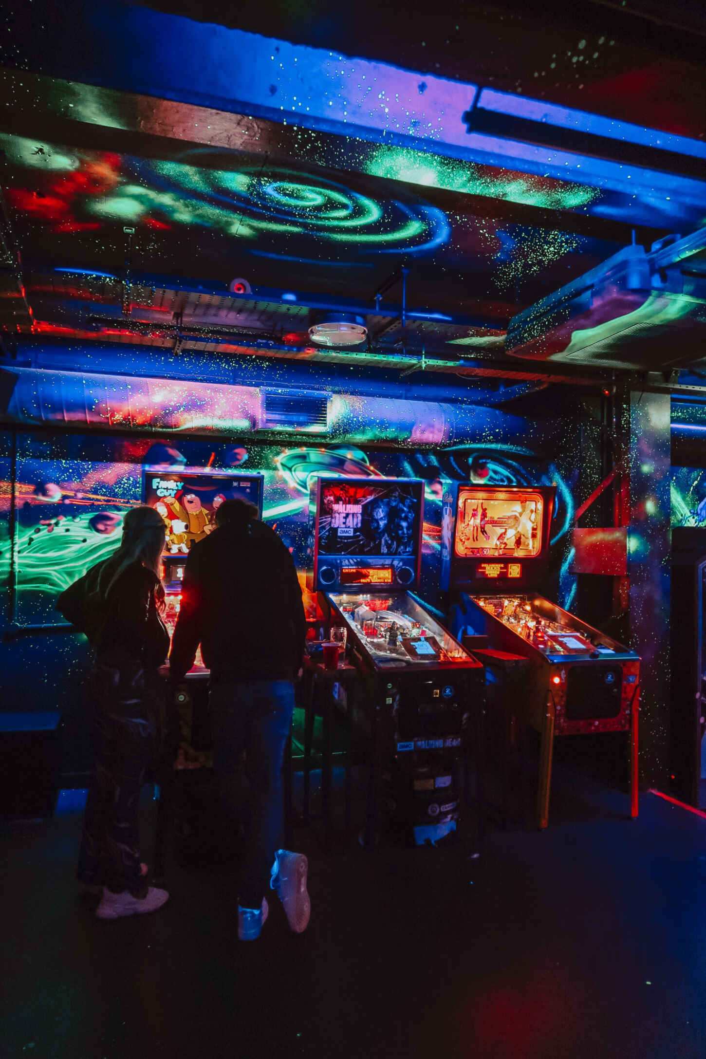 The basement bar is covered in neon graffiti, with a dance mat nestled up the corner, as well as Time Crisis II, Mario Kart and NBA Jam.