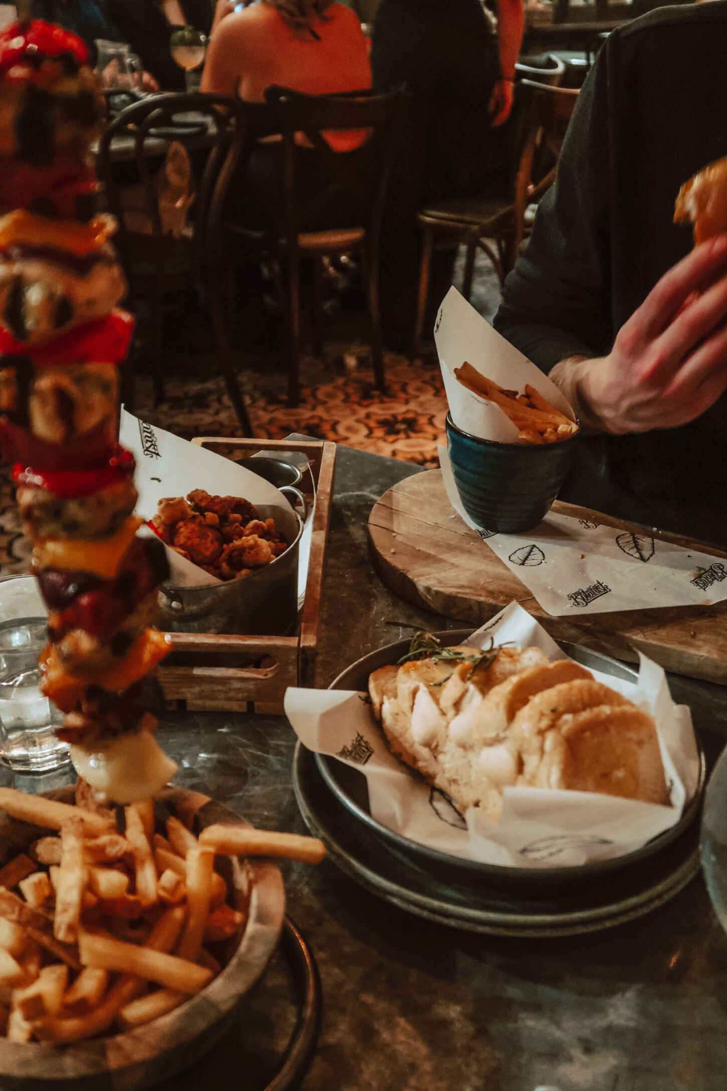 For food, Jake went for the cheeseburger dipped in bone marrrow gravy, with house sauce and properly seasoned chips, while I went for my usual – a chicken and chorizo hanging kebab marinated in herbs with smoked paprika oil with fries, which never fails to impress as the oil drips down the kebab and onto the chips.
