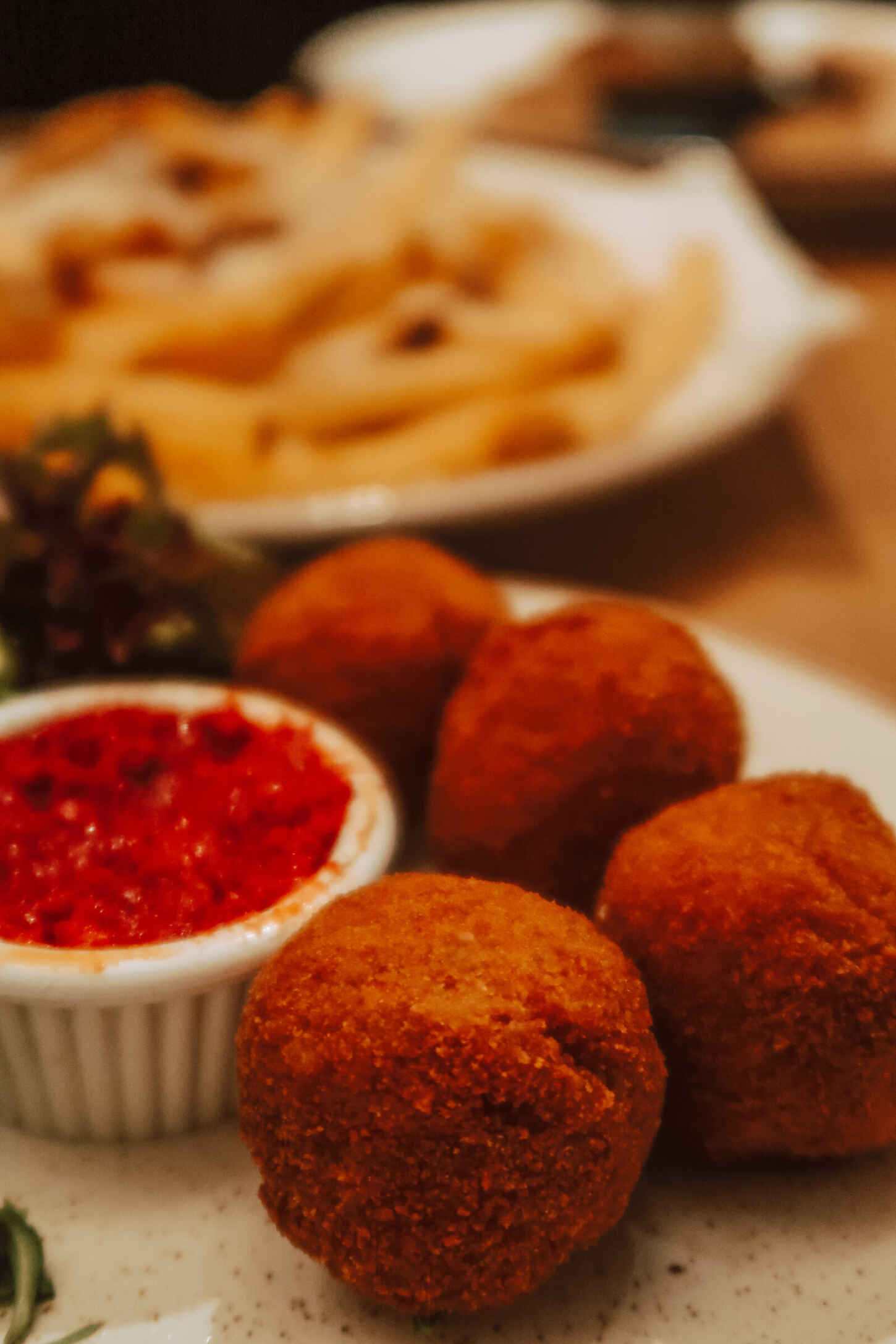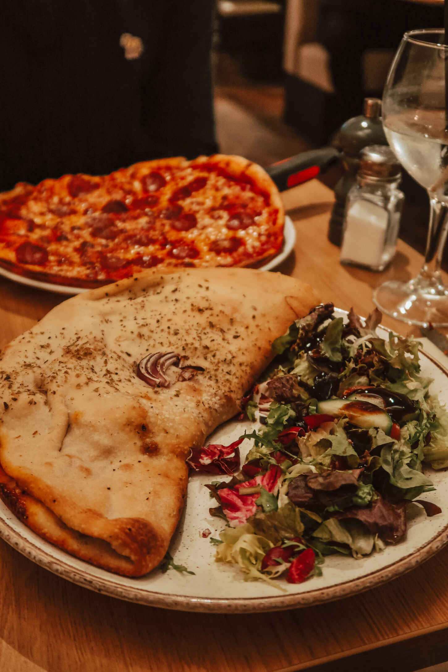 To start, me and Jake shared the dough balls and arancini – which are risotto balls filled with mozzarella and tomato that have been deep fried and served with a tangy tomato dip. Having seen a number of pizzas leave the kitchen, Jake went for a classic pepperoni pizza for £10.50, and I ordered the Rosso calzone for £12.65. The folded pizza included chicken, chorizo, red onions, peppadews and mozzarella in tomato and garlic sauce and was absolutely beautiful. But neither of us were able to finish the meal, and realised we’d have been better off sharing a pizza.