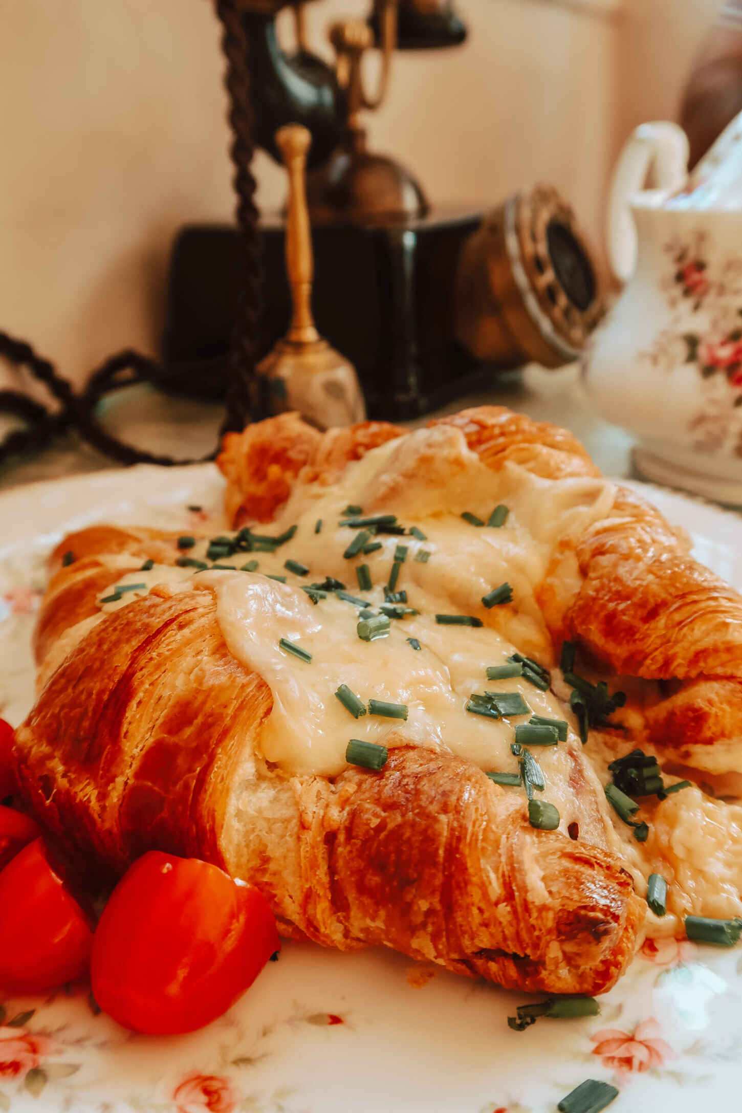 Meanwhile, I had a St Germain sprits (elderflower liqueur and prosecco) for £5.95, and the waitress was pretty generous in her pouring of fizz, practically filling the balloon glass containing the elderflower. To eat, I ordered a croissant au gratin – a toasted croissant filled with ham and creamy cheese for £6.95, served with tomatoes. It was beautifully done and really tasty, and the setting of the table and the decor was fab.