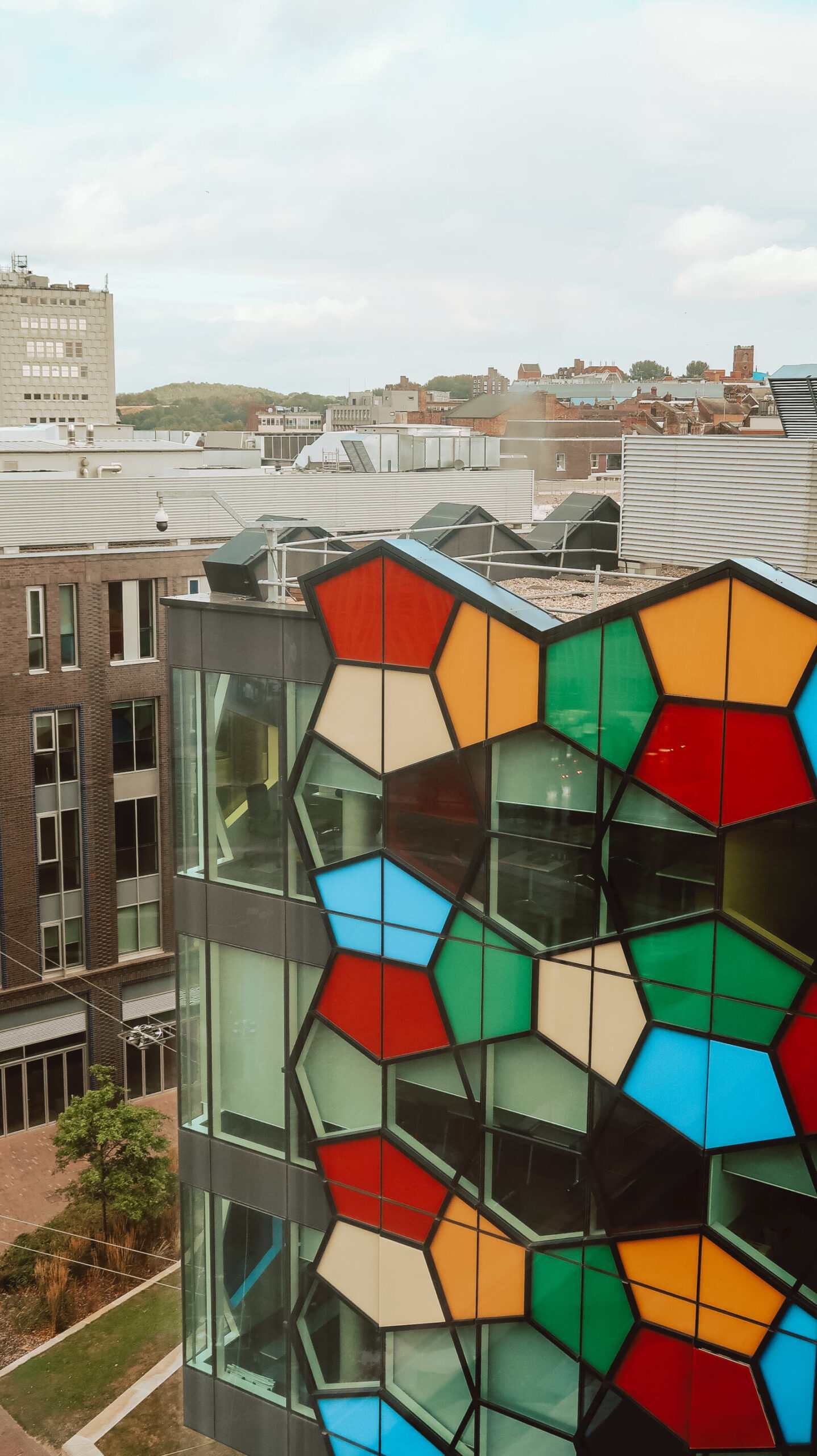 Nothing quite says ‘welcome to Stoke-on-Trent, duck’, than looking out of the window to the old Smithfield Pottery bottle kiln. The Grade II listed structure was named after the Smithfield Cattle Market nearby and was built in 1880 on land owned by rope manufacturer, Thomas Hinde. There’s a beautiful view of the potbank from the sixth floor as you step out of the elevator.Another great photo opportunity is from the other side of the hotel, past room 630, where you can look down on the colourful glass Smithfield One. Rooms on this side of the hotel also overlook the Smithfield development – a community space often used for open-air events like cinema nights and a free ‘beach’.