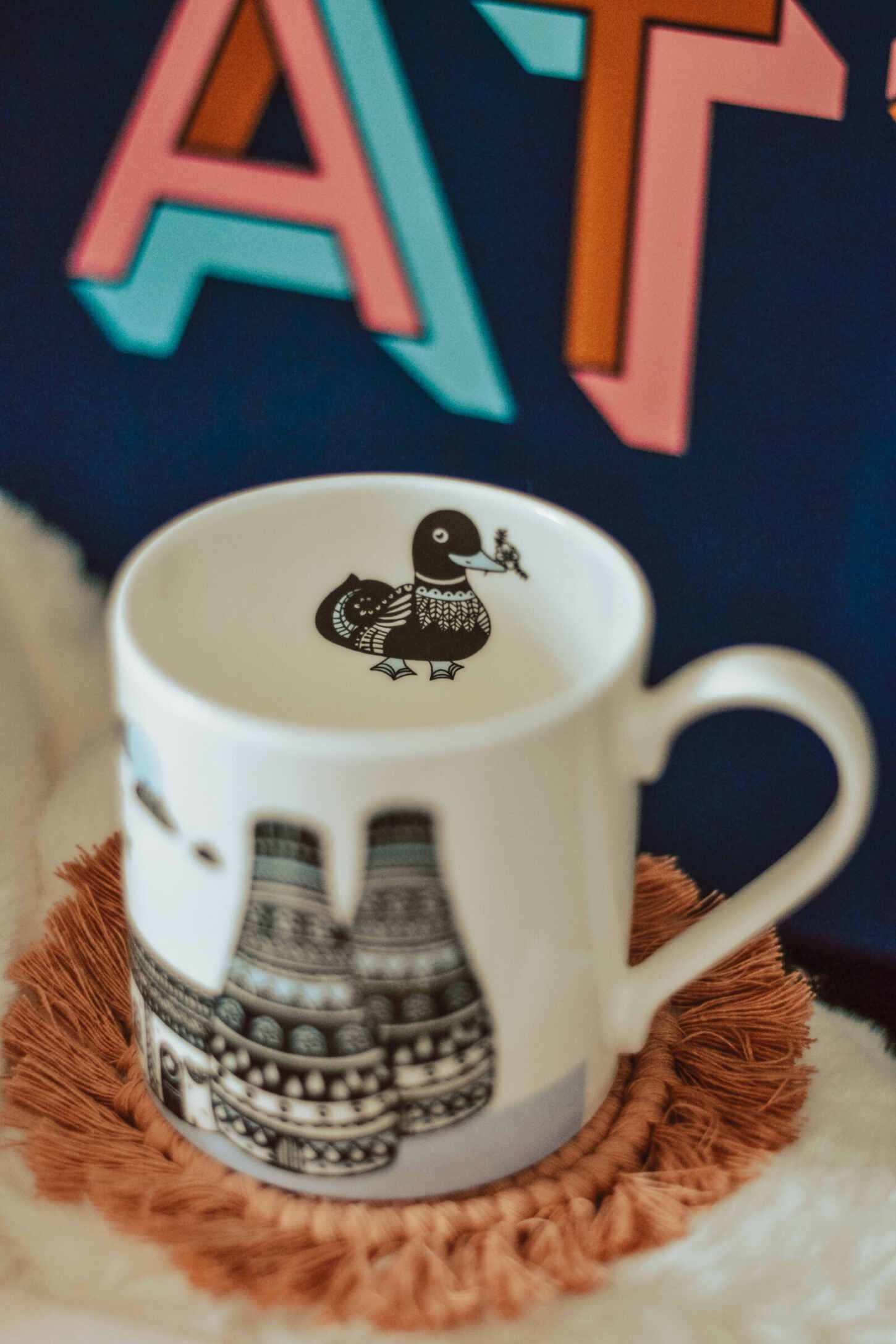 The mug is priced at £15 and comes in sage or lavender. It features an illustrated design hand drawn and decorated by the mum-of-two, complete with a little duck inside, who you’ll find ‘swimming’ in your morning cuppa. I particularly like the splash of colour in their beak, which matches those woven into the outer pattern.