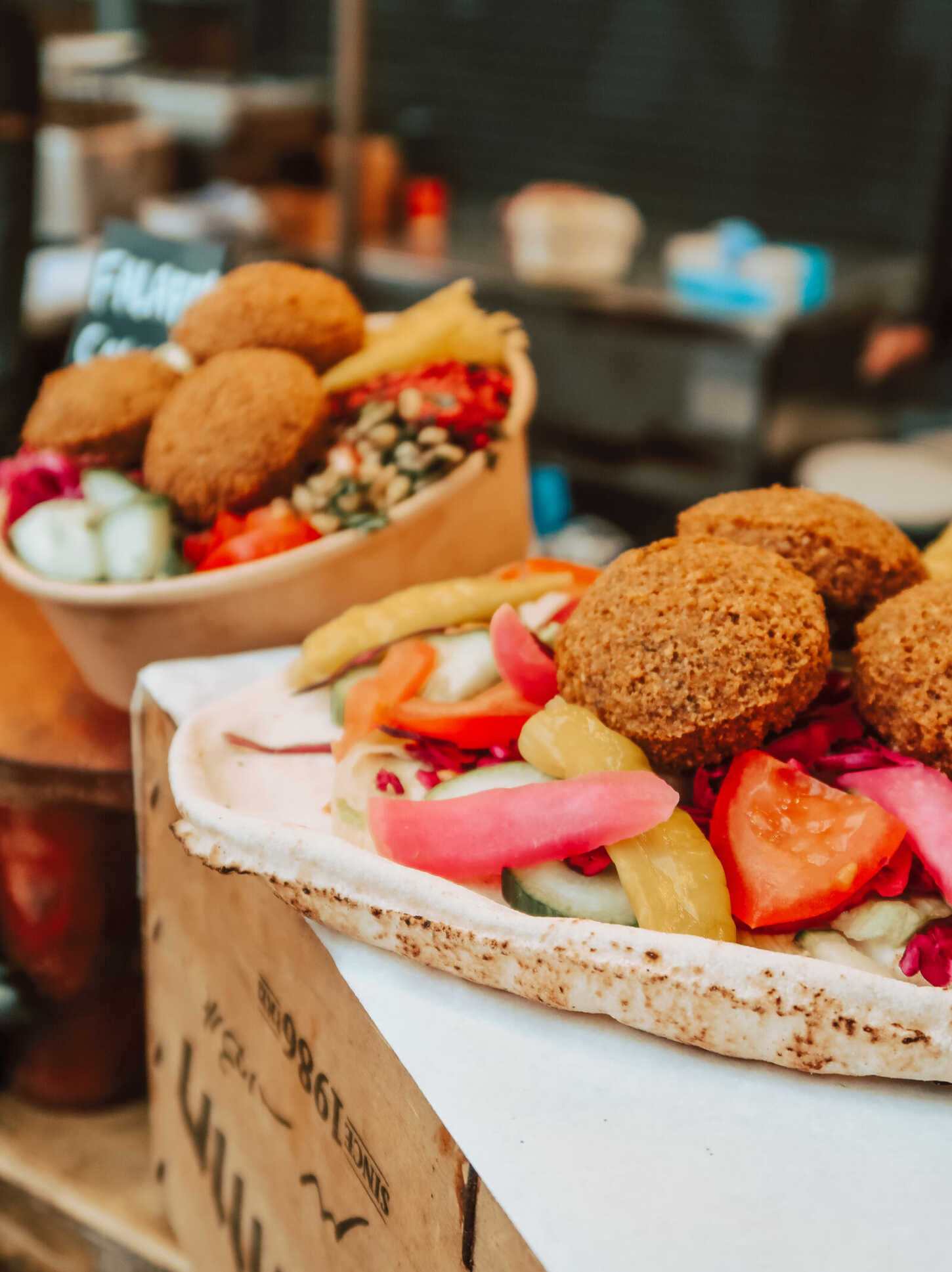 The stall also offers deli classics such as potato latkes, schnitzels and freshly made falafels served in a wrap or salad box, as well as a number of dishes made in collaboration with fellow Market stallholders such as smoked salmon and cream cheese bagels made with fish from Shellseekers Fish and Game, and a Jumi Cheese raclette melt.