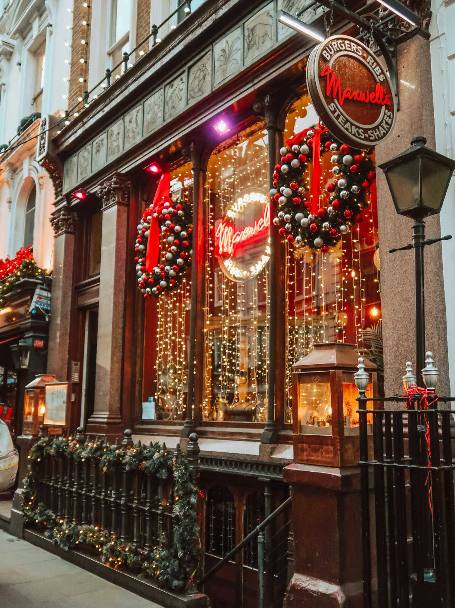 After dropping off our luggage and gushing over the bathroom tiles, we caught the tube to Covent Garden, popping into a couple of shops as we admired the multiple Christmas trees dotted outside shops and in the main courtyard. We had a table booked at Maxwell’s for 4pm, arriving just in time for Happy Hour, which sees cocktails priced at £6.50 until 5pm.