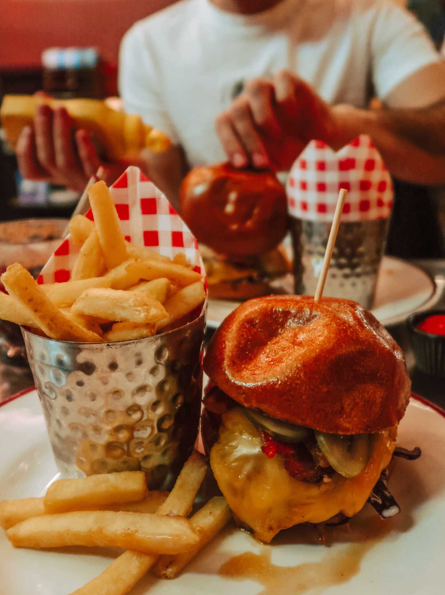 Maxwell’s Bar & Grill opened in the early 1980s and still remains a favourite amongst locals and tourists visiting London’s West End. The all-American diner-style venue offers familiarity in the form of beefed-up burgers, seasoned fries, steaks and sides. I can certainly see why it was Jake’s first choice. Both of us ordered Piggy Back burgers featuring pulled pork, bacon, cheese pickles and BBQ sauce for £15.95 each.