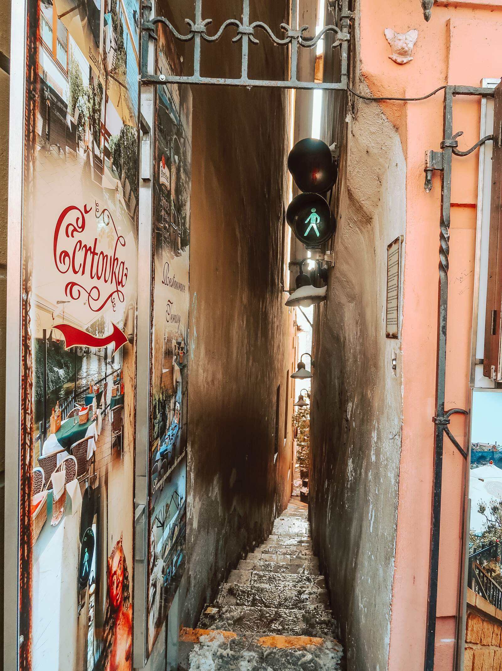 Crossing Charles Bridge we visited the Narrowest Street in Prague, which we had tried to do on the Sunday but the queues were very long. Instead, we arrived around 11.20am where only a handful of people had gathered, seeing as it opens daily at 11.30am. This is because the stairs down the street actually lead to a restaurant – and I’d definitely recommend supporting them by grabbing a coffee at the bottom before returning. The street is no more than 20 inches wide, big enough for only one person at a time, which means it requires its own traffic light system to allow those at the bottom back up, as it’s essentially a dead end save for the bar. Definitely try to do this one as soon as it opens, and on a weekday if you can. We found the Monday considerably quieter in Prague, which was a nice and relaxing end to the whirlwind trip.