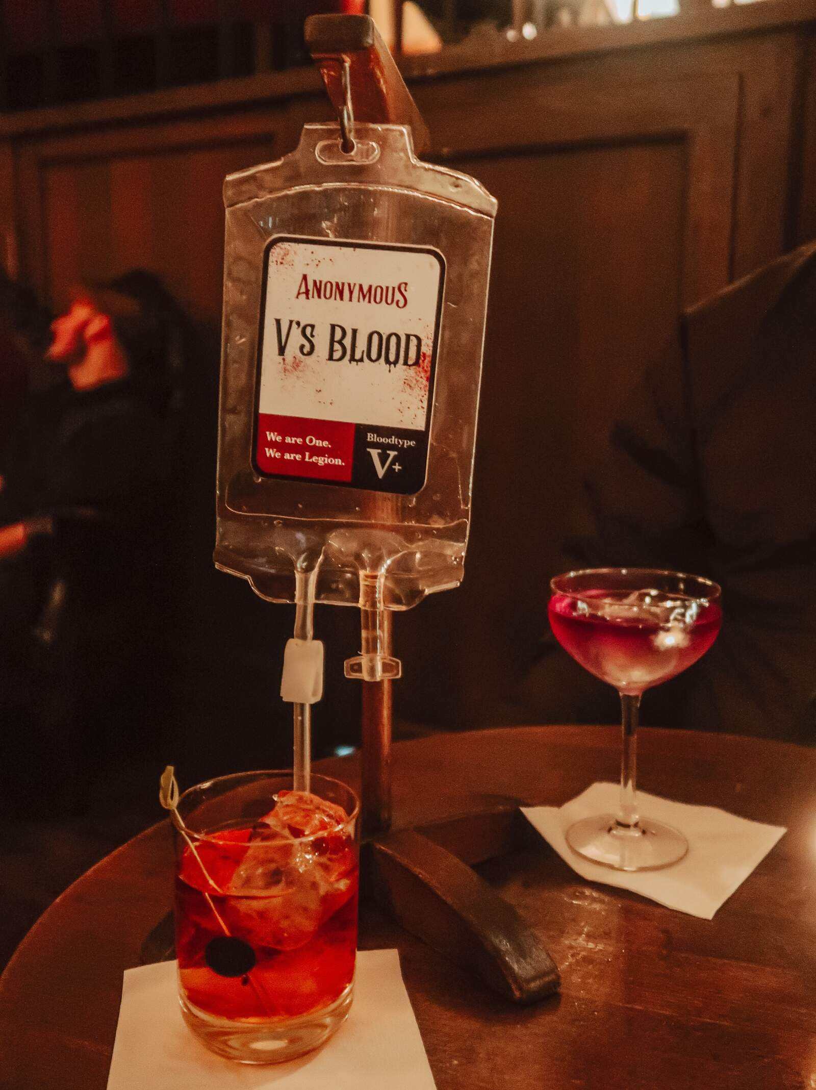 We were seated in the underground-style lounge and offered a cocktail menu – I ordered a V’s Blood with Jake selecting a Three Waters. The bar is based on a concept that combines Guy Fawkes, V for Vendetta and the Anonymous Movement, with bartenders delivering drinks wearing masks while theatrically pouring cocktails with a side of pyro, or served in blood bags.