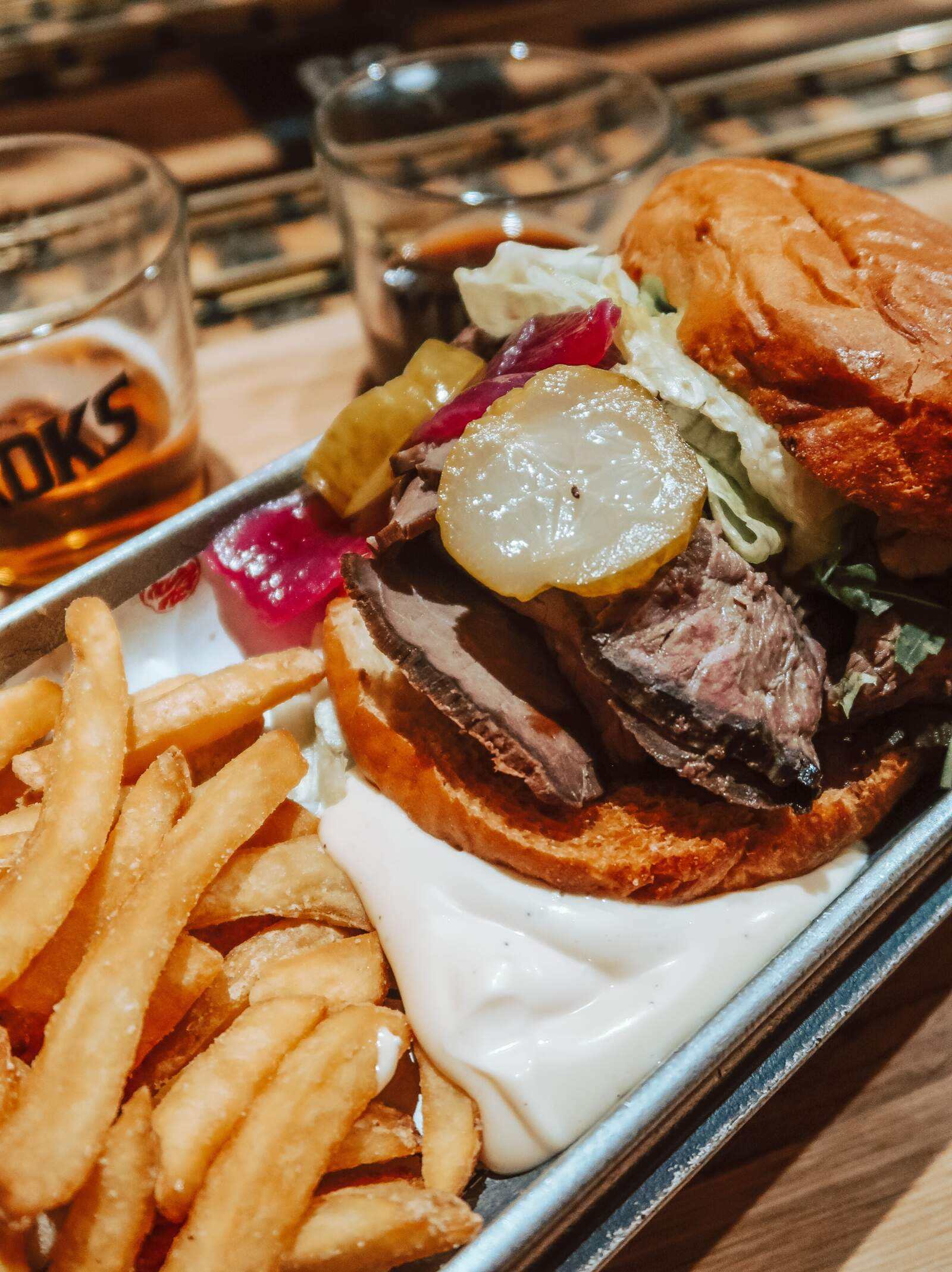 To eat, we both ordered the roasted beef burger, watching it arrive in silver metal containers, the train stopping right in front of us to retrieve them. The bun was stacked with marinated slices of beef with mixed salad, pickled gherkin, glazed red onion and BBQ sauce, served with a side of seasoned fries. It was probably my favourite meal of the trip, combining genuinely good gastronomy with playful presentation, really bringing out diners’ inner child as they tucked into their trays.