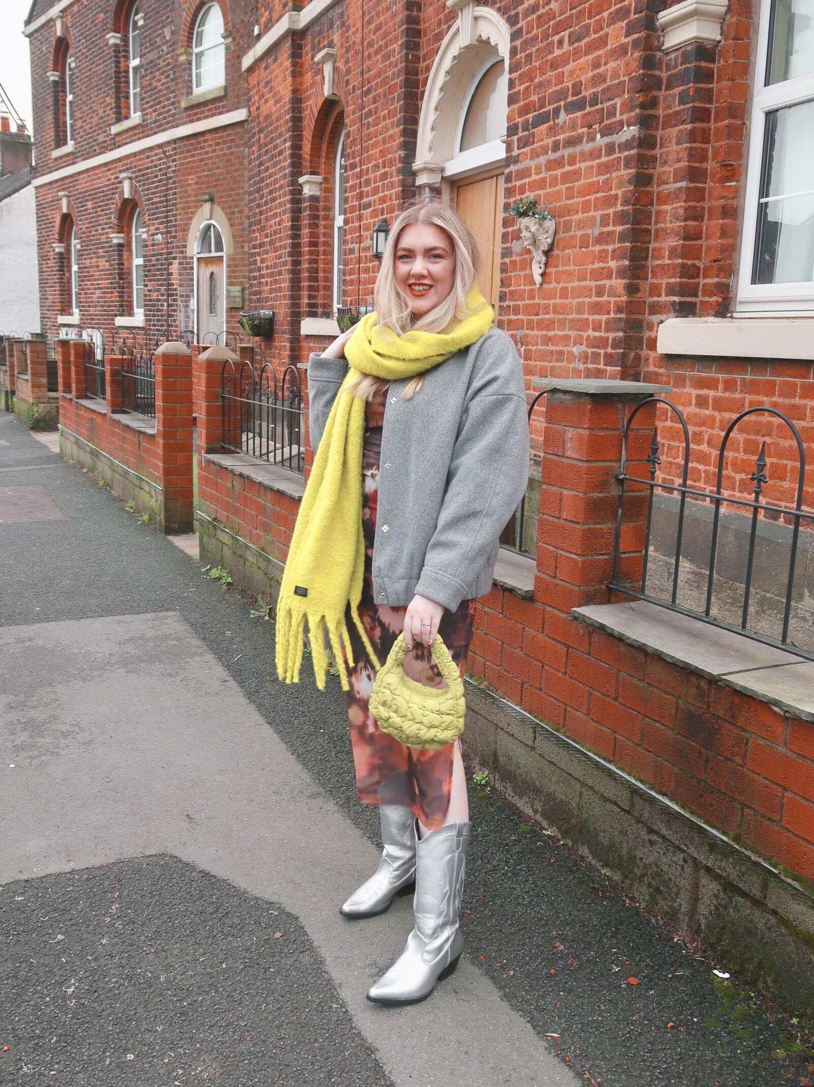 I adore the pistachio-green hue and the way it really pops against any outfit. Here, I’ve styled it with a ruched mesh dress from Tu Clothing, my oversized River Island bomber jacket, silver cowboy boots from Primark, and my green blanket scarf from Moss, which ties in the colour of the bag beautifully.