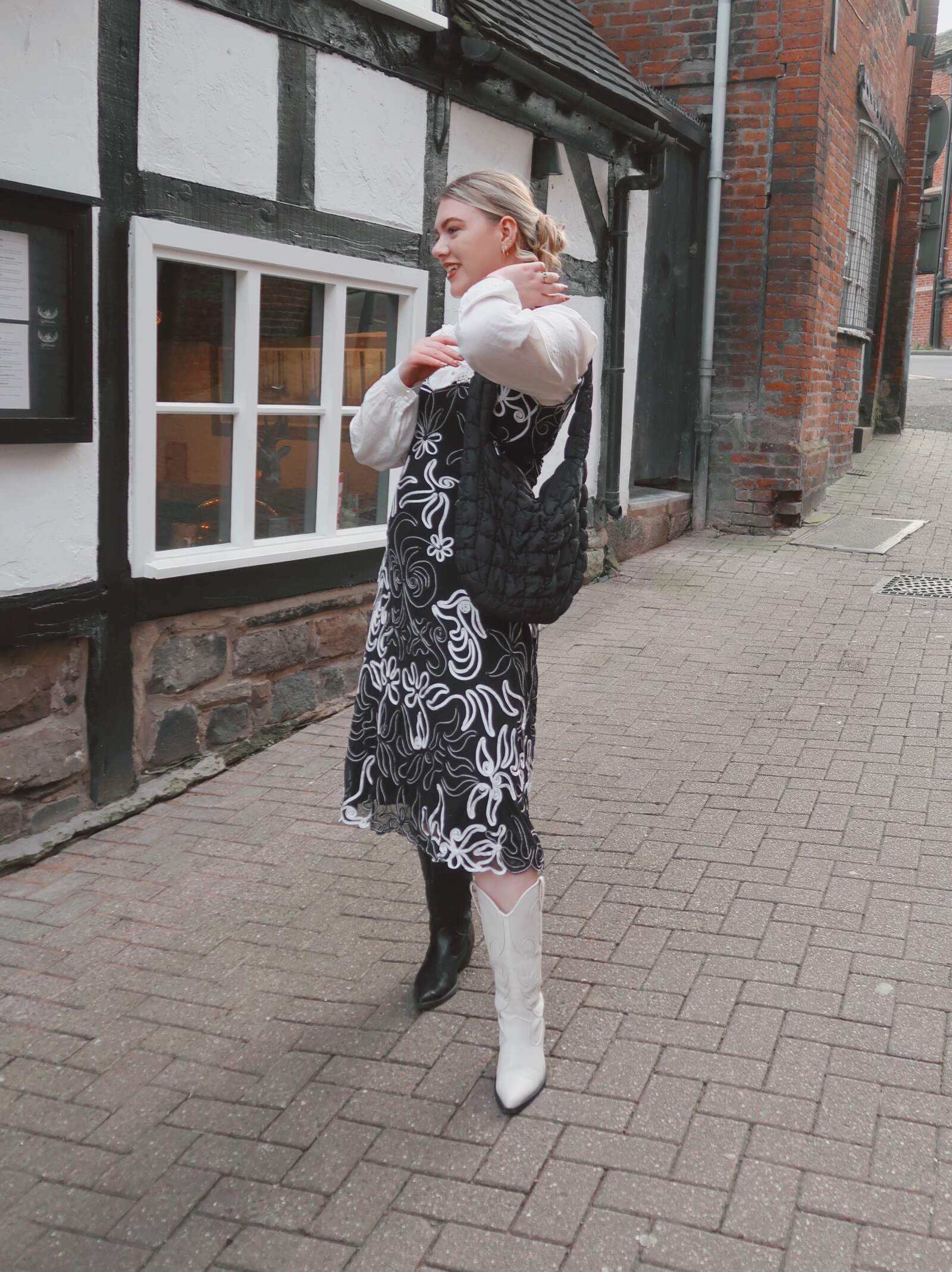 Complete with zip pockets and a zip closure, it’s a secure option for city trips and its black colourway makes it an easy choice for most outfits, but it’s also available in a wide range of colours if you’re more of a dopamine dresser. I paired it with my nan’s oversized collar blouse and a charity shop dress from Phase Eight, mix-and-match Primark cowboy boots and gold jewellery.