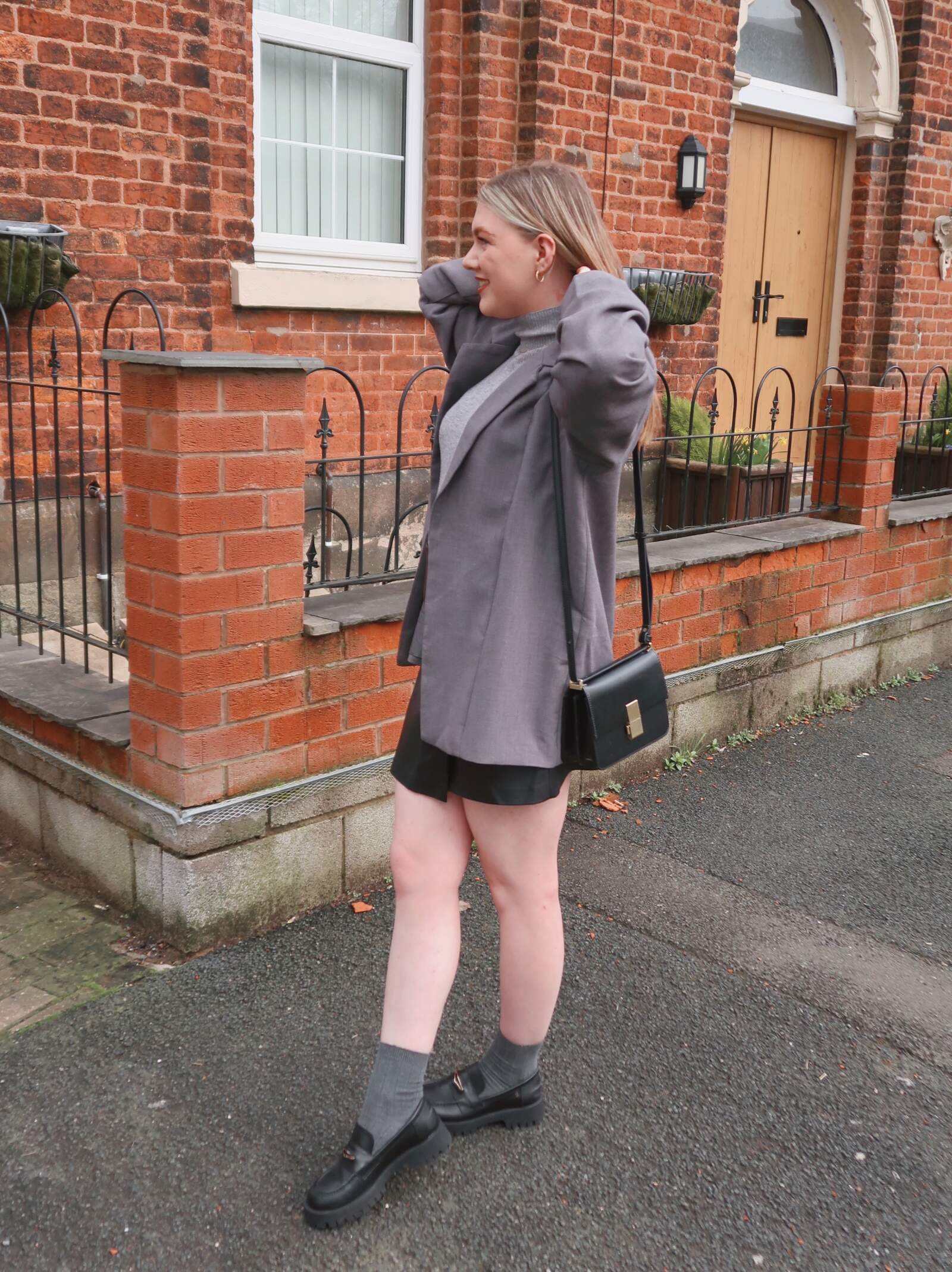 I styled the blazer with a faux leather mini skirt adorned with gold detailing from River Island, which tied in nicely with my gold Abbott Lyon necklace and hoop earrings, as well as the hardware on my Marks and Spencer faux leather crossbody (a lookalike for a well-known designer bag from Celine). I layered it over a grey ribbed turtleneck vest, finishing the look with some grey socks and my black leather loafers from Kurt Geiger.
