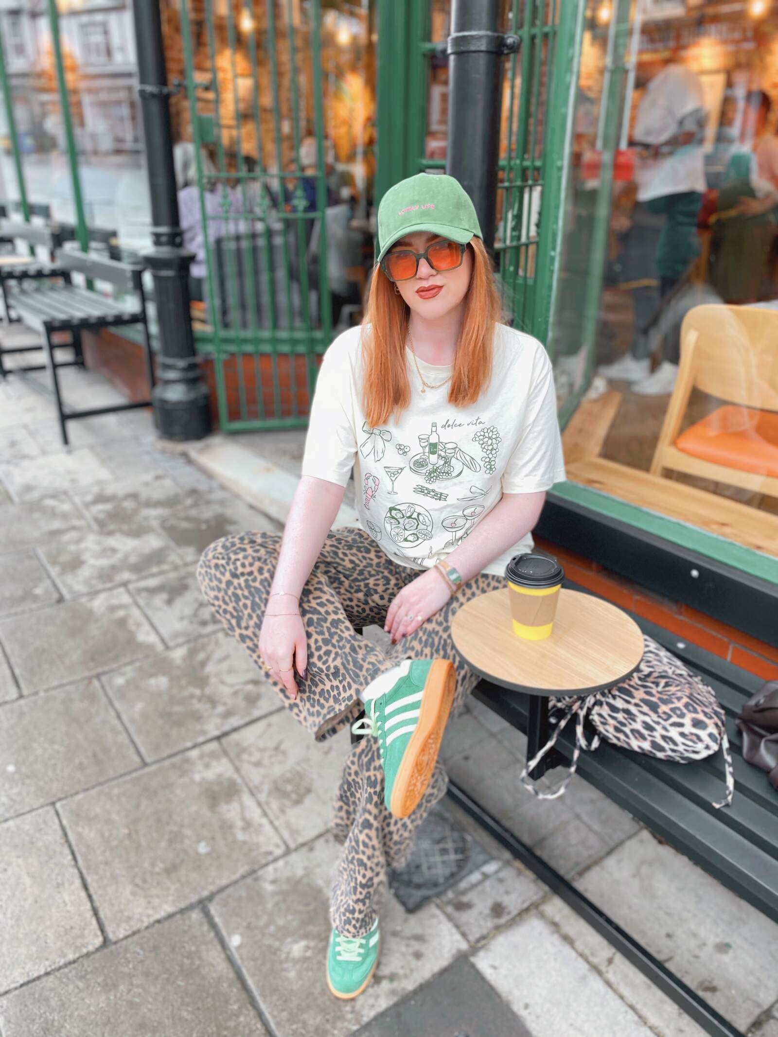 I tied in the green tones of the outfit with my accessories, opting for my Adidas Handball Spezials, green-framed sunglasses with a rosy tint and an embroidered cap from River Island which says ‘lovely life’ on the front in pink. I love this sandwich method when it comes to colour – it’s the ultimate styling hack and I’ve yet to see it fail me – and I really like how there are still little pops of pink in there, as well.