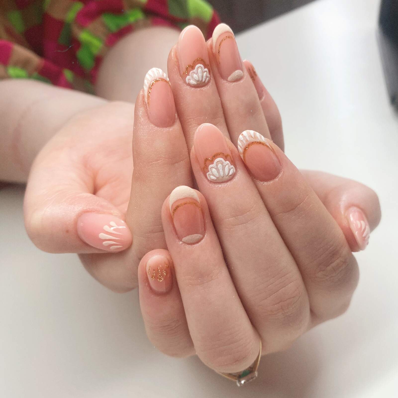7. Seashells are very much trending for 2025, particularly in jewellery but in nail art, too. This set uses acrylic powder to create a 3D design perfect for a beach getaway. Gold accents really set off the manicure, giving that golden hour feel and the texture of these is insanely addictive.