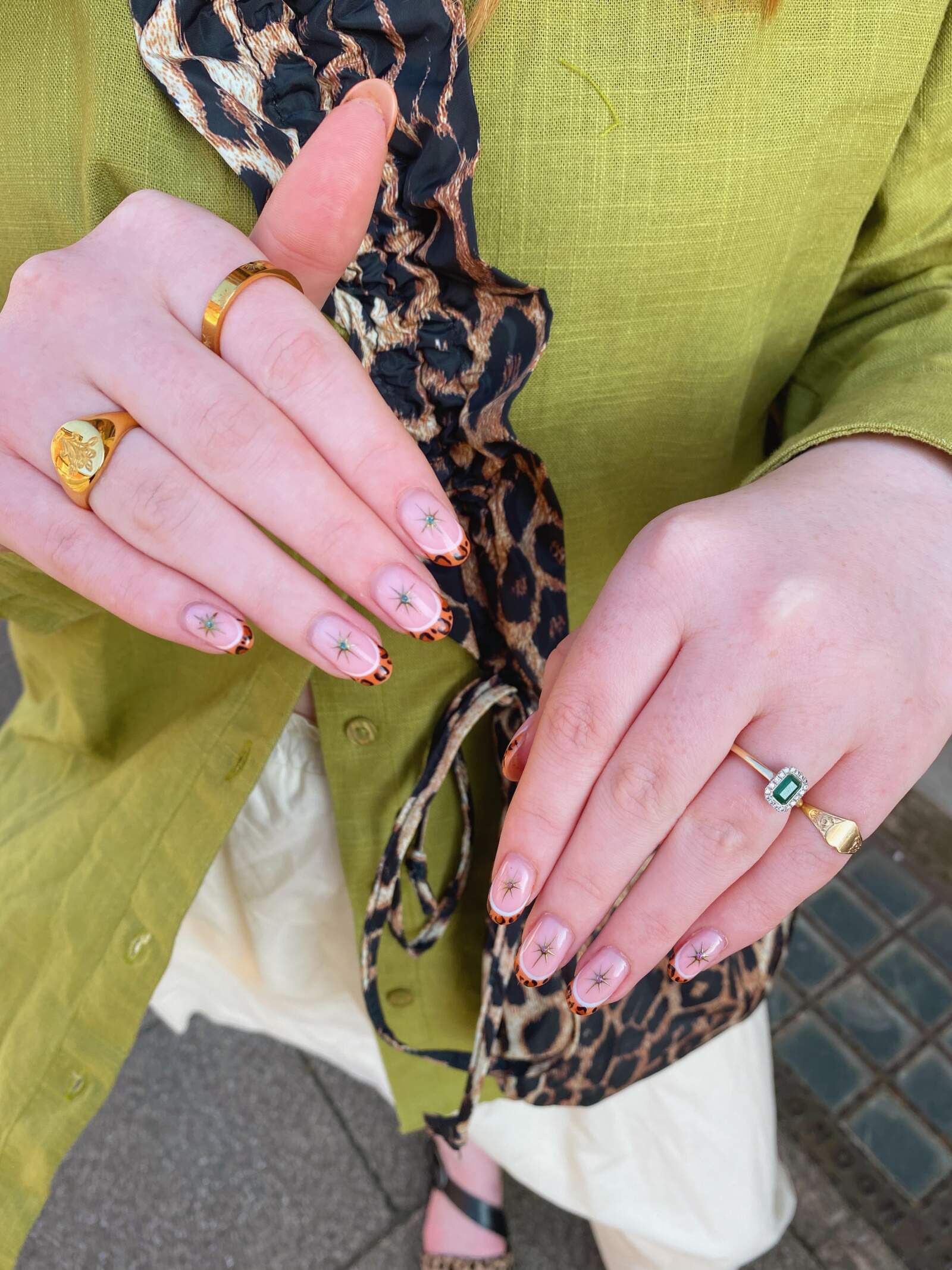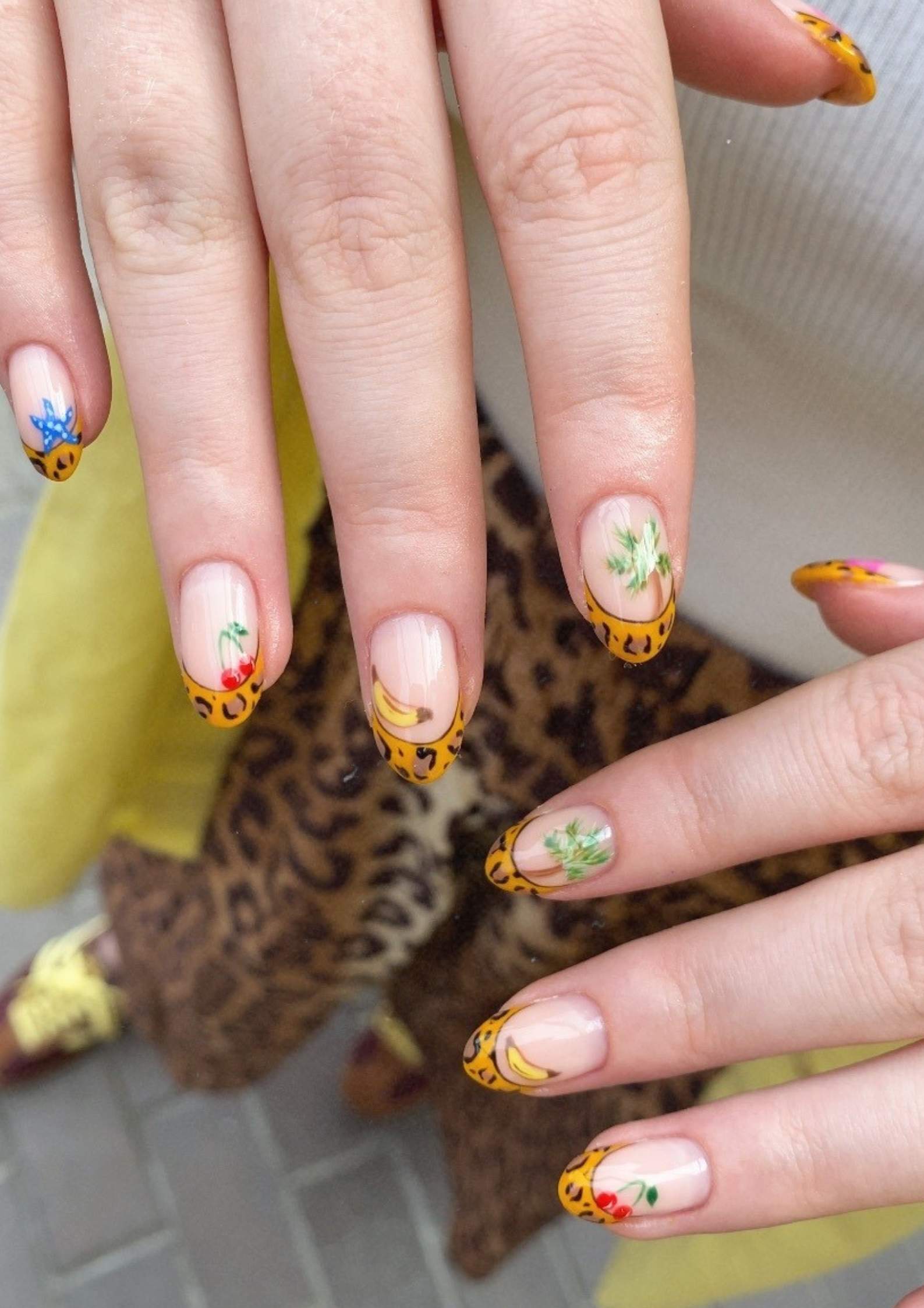 4. These were actually my holiday nails last year. They’re another leopard print french tip but with an entirely different vibe, swapping chrome stars for a fun and colourful set. Starfish, bananas, cherries and a palm tree adorn each nail for a playful pick and mix, European market vibe. Cue the photos in front of a fruit stall with a string shopper.