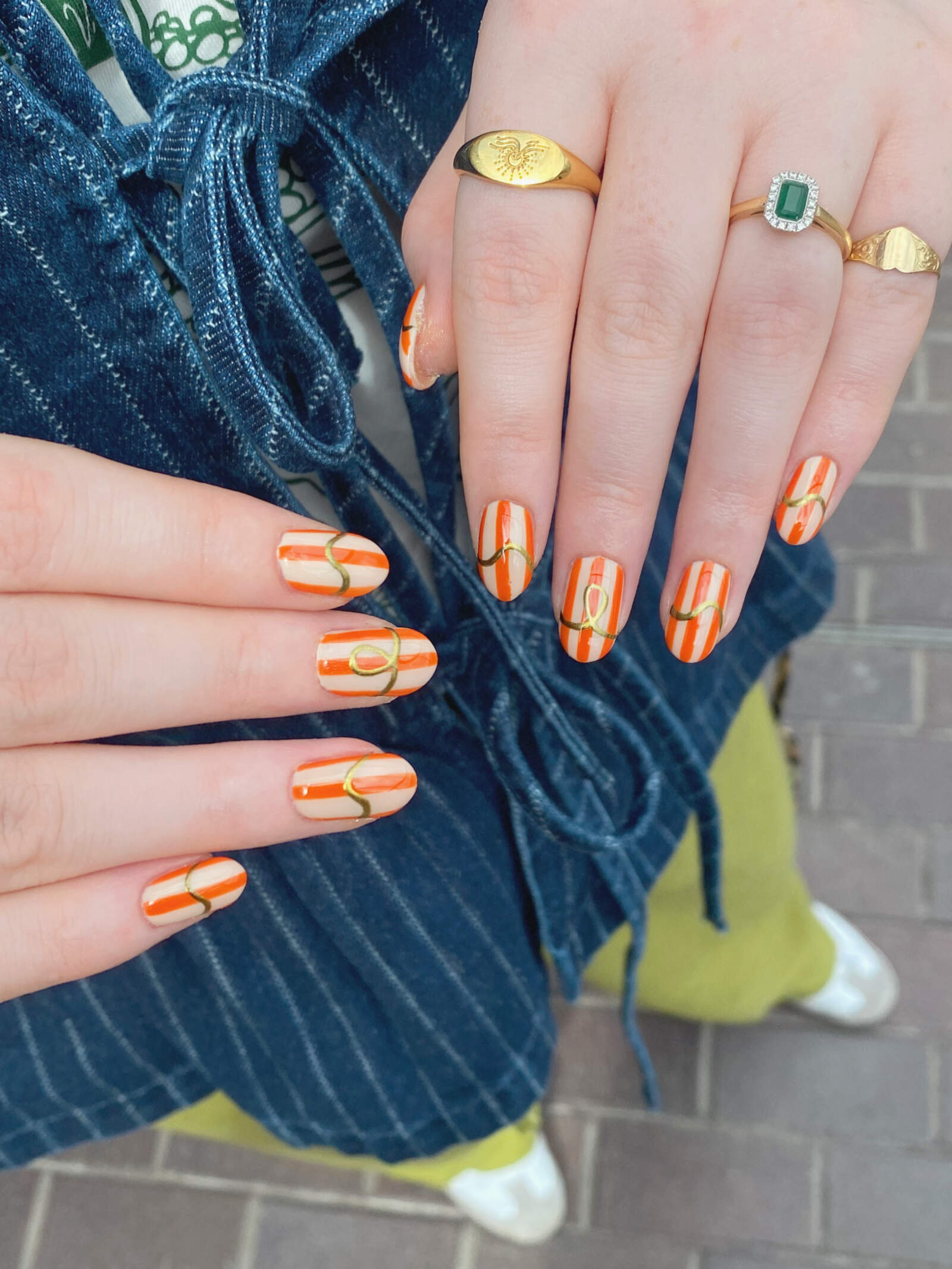 1. If aperol spritz, solero ice lollies and deck chairs were nail art, this would be it. This set is making me want to sit in the sun in a floaty dress with a chilled cocktail in my hand. ‘Humbug’ nails were a big trend around Christmas and this feels like a very summery take on the trend, with the chrome swirls adding a little je ne sais quoi.