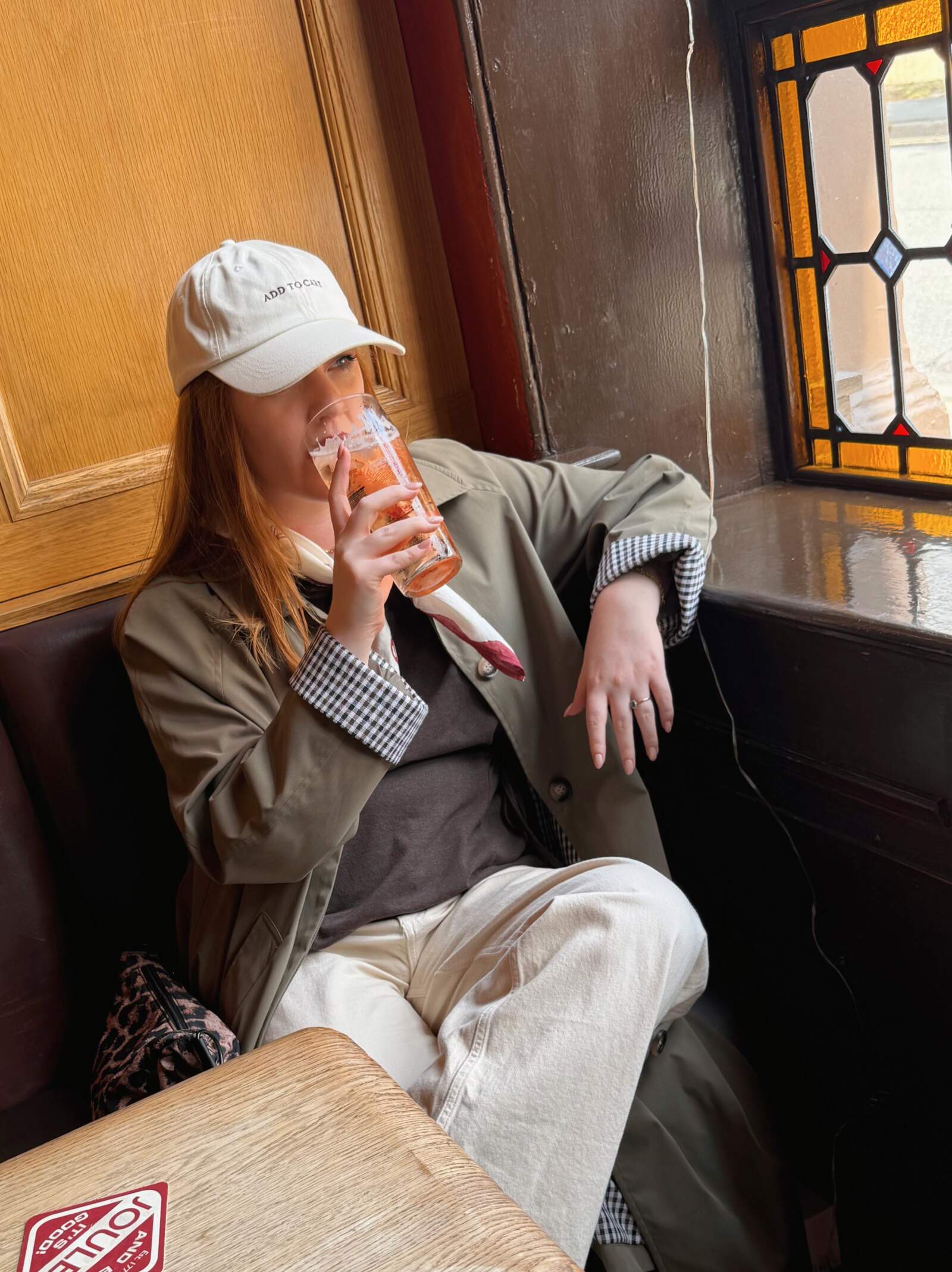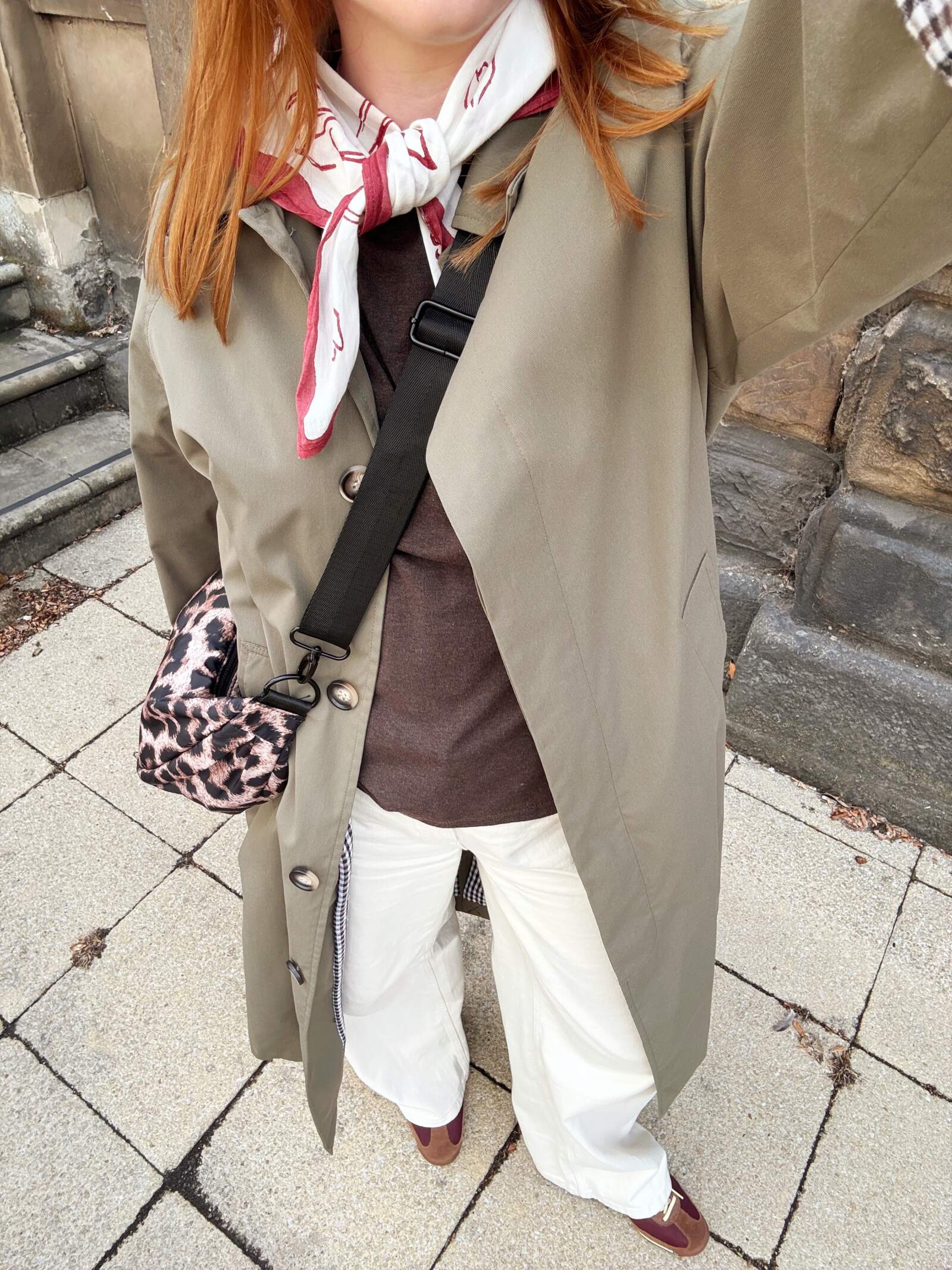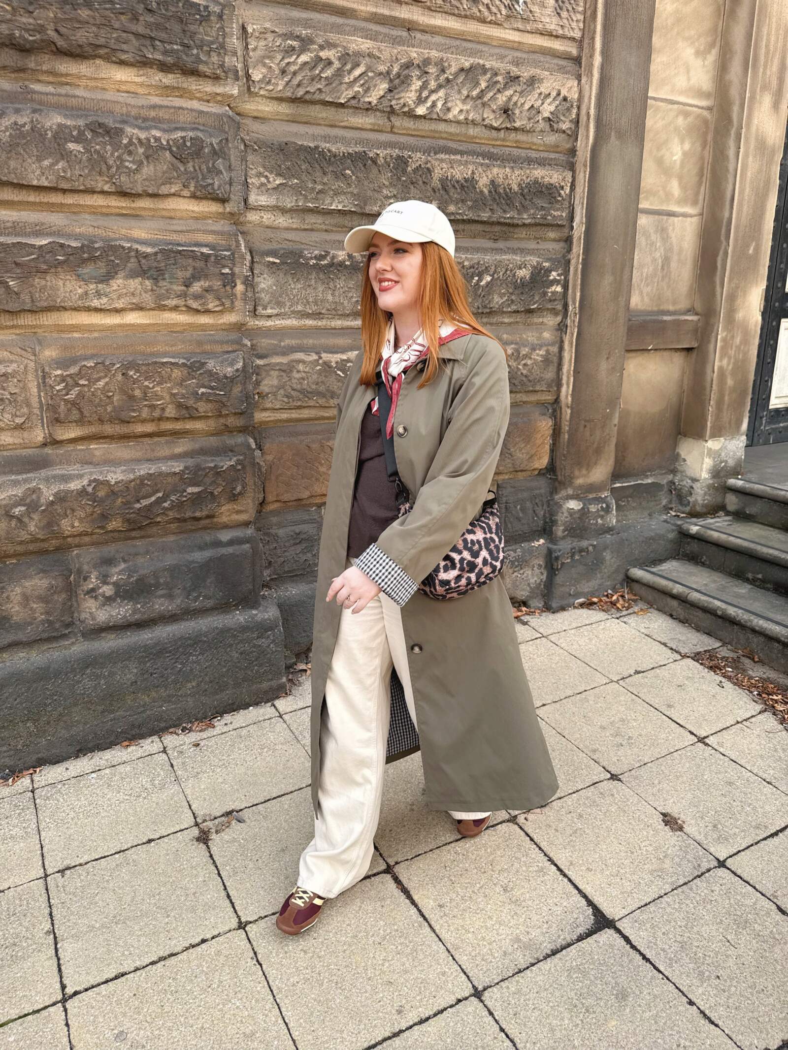 Already I’ve found myself reaching for it when heading out to the pub or coffee shop, or dropping Vinted parcels down at the shop. One of my favourite stylings has been with my ecru wide-leg jeans from M&S and chocolate brown ASOS T-shirt for an earthy, relaxed base. My SL72 trainers tie in all of the muted, autumnal tones while my leopard crossbody (Matalan) adds a pop of personality. I completed the look with a TBCo neck scarf and a Primark baseball cap that aptly reads ‘add to cart’.
