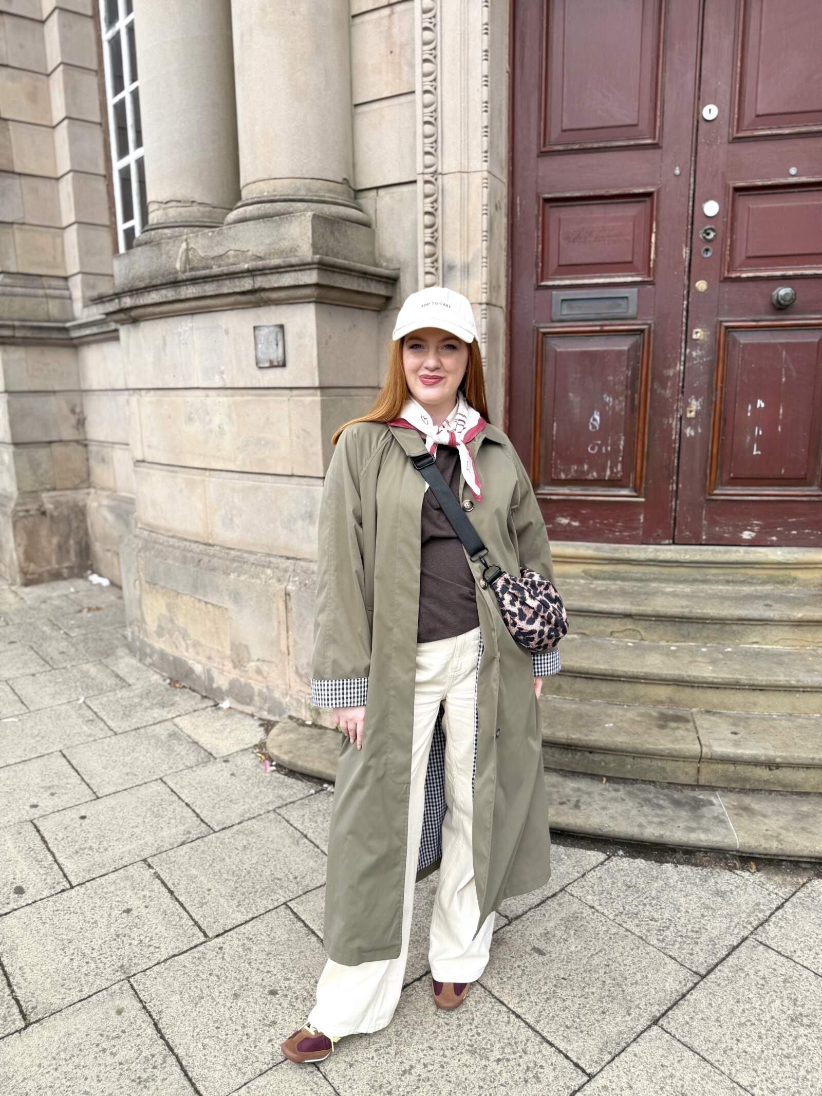 Already I’ve found myself reaching for it when heading out to the pub or coffee shop, or dropping Vinted parcels down at the shop. One of my favourite stylings has been with my ecru wide-leg jeans from M&S and chocolate brown ASOS T-shirt for an earthy, relaxed base. My SL72 trainers tie in all of the muted, autumnal tones while my leopard crossbody (Matalan) adds a pop of personality. I completed the look with a TBCo neck scarf and a Primark baseball cap that aptly reads ‘add to cart’.