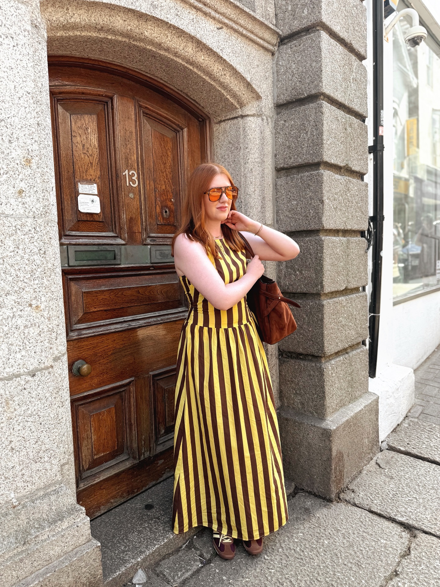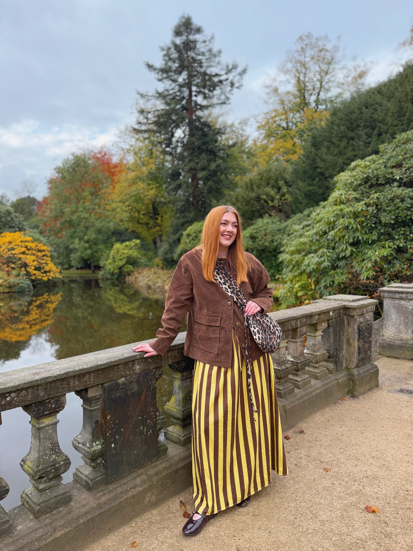 This combination feels very autumnal and was the ideal way for me to take one of my most-worn summer dresses and carry it into the cooler months. This brown and yellow striped dress from ASOS has an extremely fitted bodice, allowing almost anything to be layered over it with ease.
