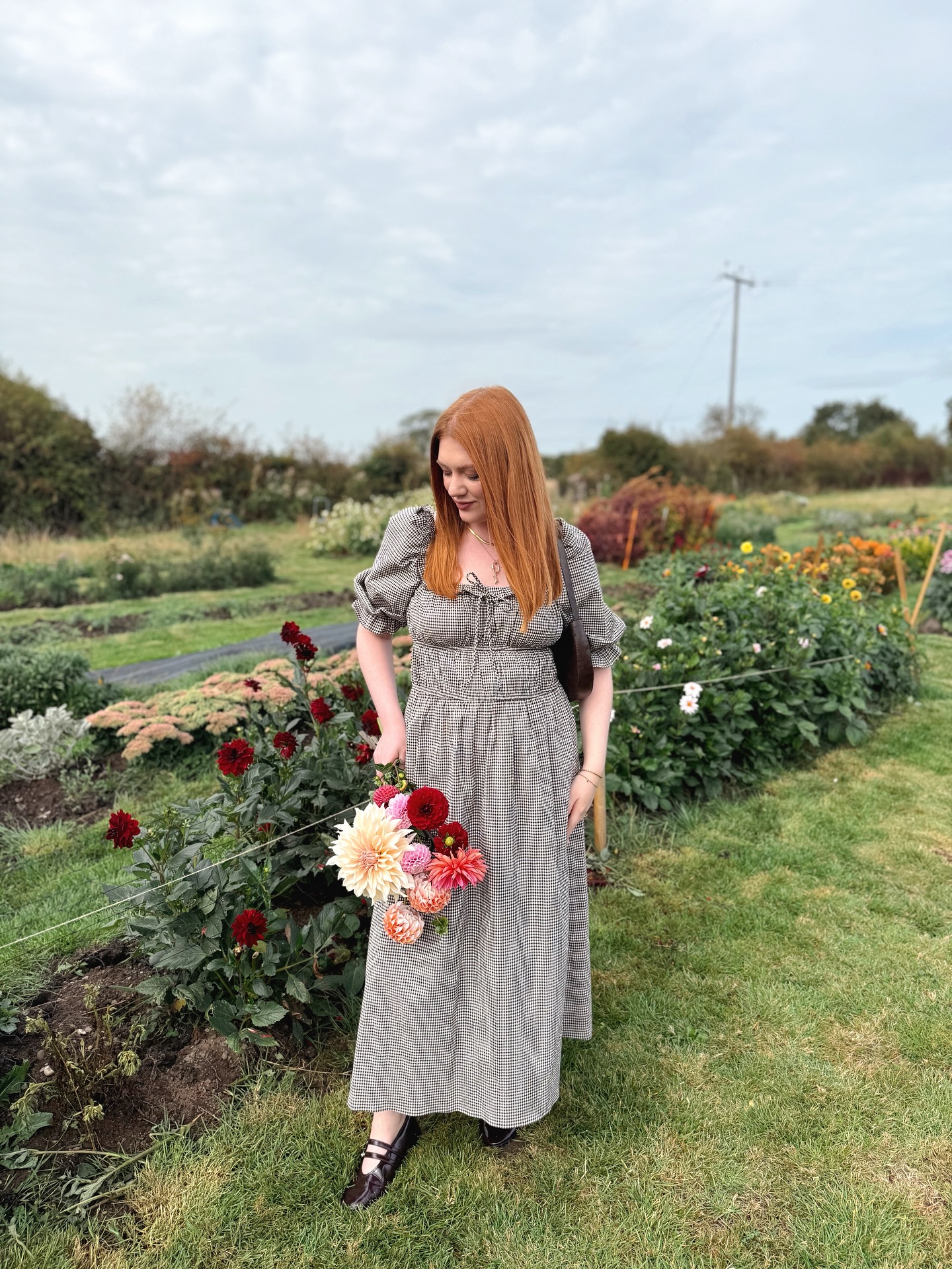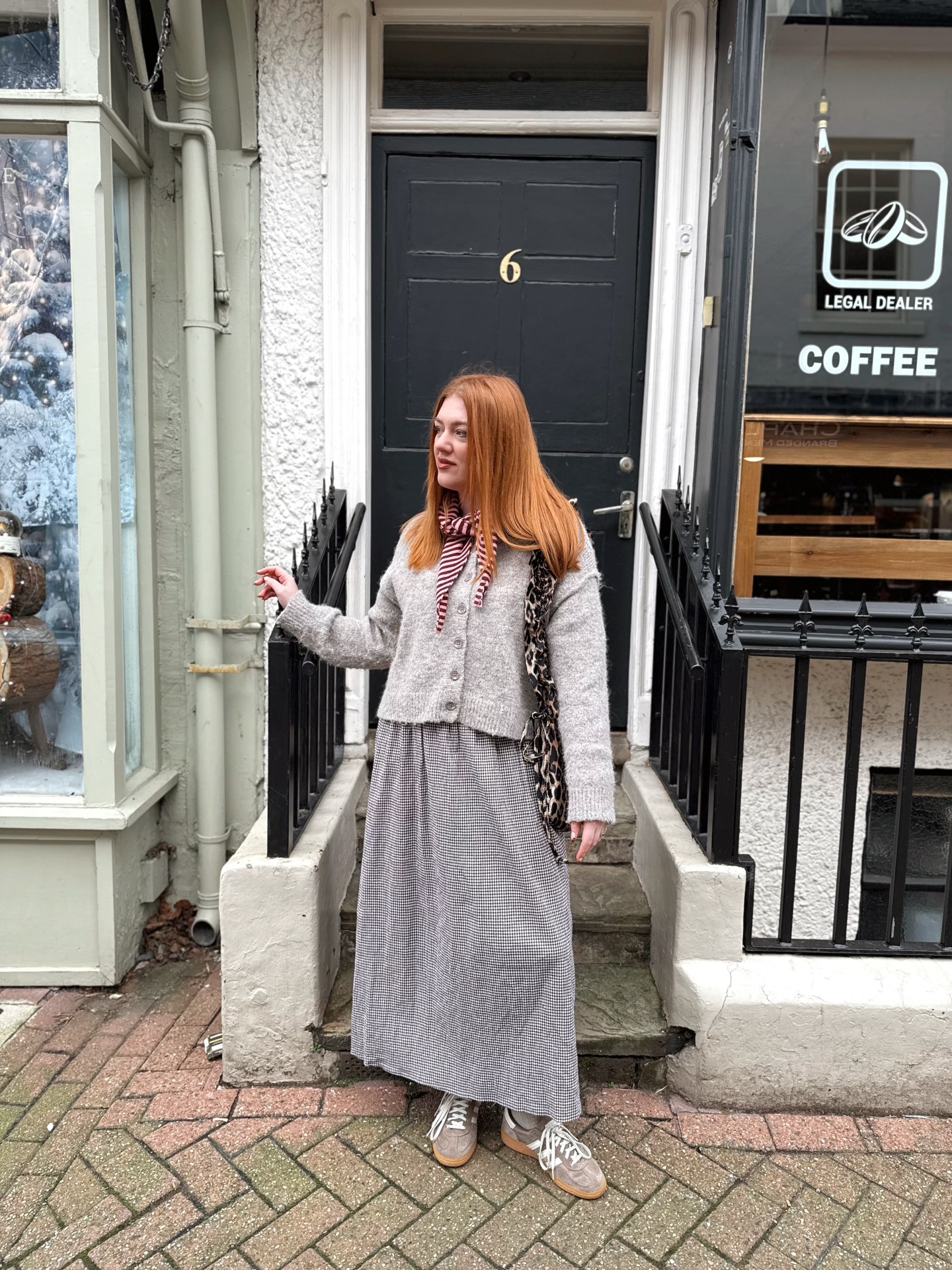 The chocolate gingham paired beautifully with the mushroom knit and trainers for an earthy tonal look. However, as this dress has puff sleeves and tie detailing at the front, it was a little trickier to disguise that it was, in fact, a frock.
