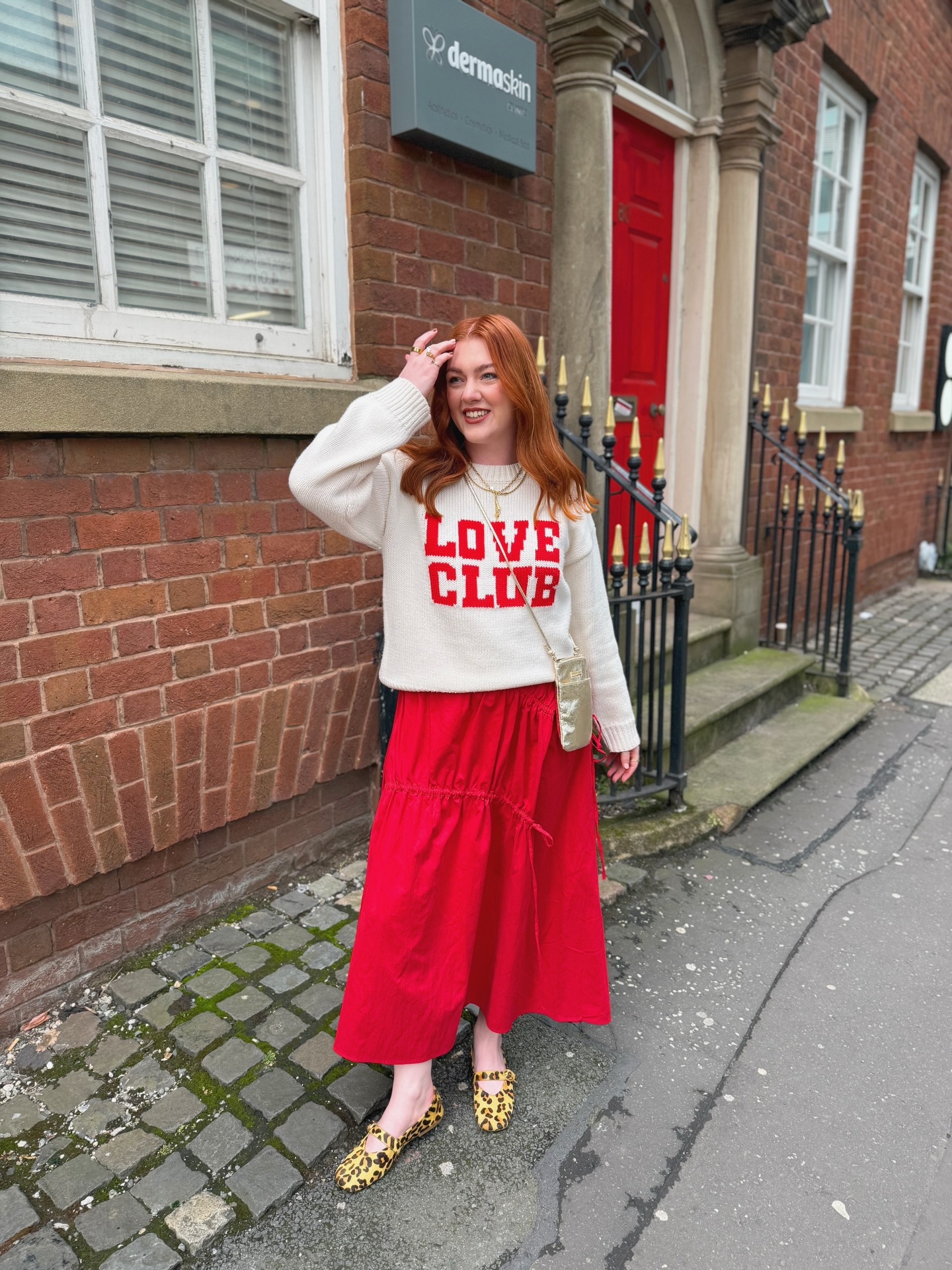 I maintained a red theme with my Tu Clothing Love Club knit – a £24 bargain that feels a little Slow Love inspired. The knit adds personality and I really enjoyed the juxtaposition between the cosy jumper and more elevated bottom. I finished this look with fun shoes (leather ballet flats from ASOS via Vinted) and a gold bag for the ultimate Valentine’s Day outfit. That said, I don’t think it’s so February 14-coded that this couldn’t be worn any time, either.