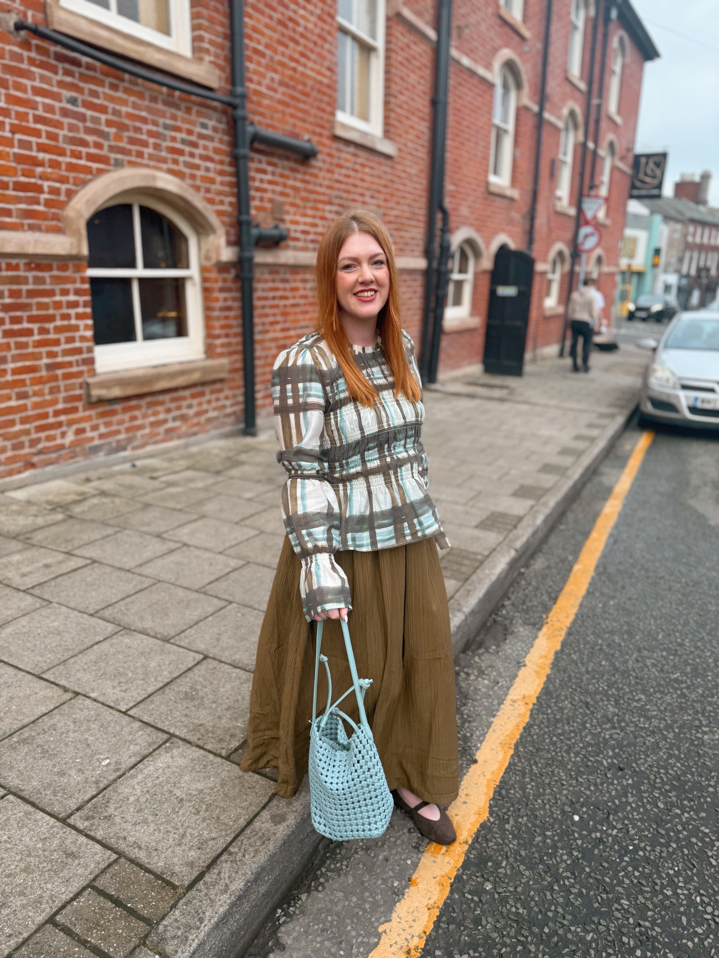 I really love the contrast of the pattern and shape against the softer, block colour of the skirt, while the top still ties in those olive tones, while introducing new blue and chocolate hues. I paired the look with a blue bag and brown suede ballet flats for an outfit that looks well thought-out and considered. I can officially cross ‘olive cotton skirt’ off my wardrobe wishlist.