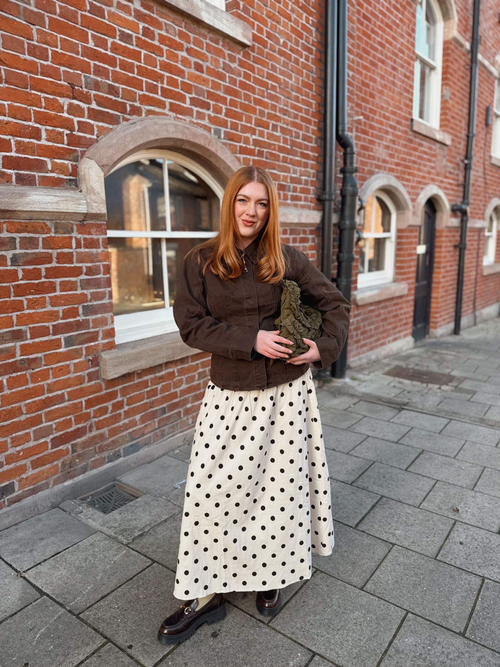And if you want to go a little more daring, a double polka dot is so fun. Take this TU denim top in a buttermilk hue for example. I styled this with a reverse dot, so brown base and creamy polka dots for a head-to-toe print that still felt really elevated. The skirt is from ASOS and I already know I’ll be wearing it on repeat.