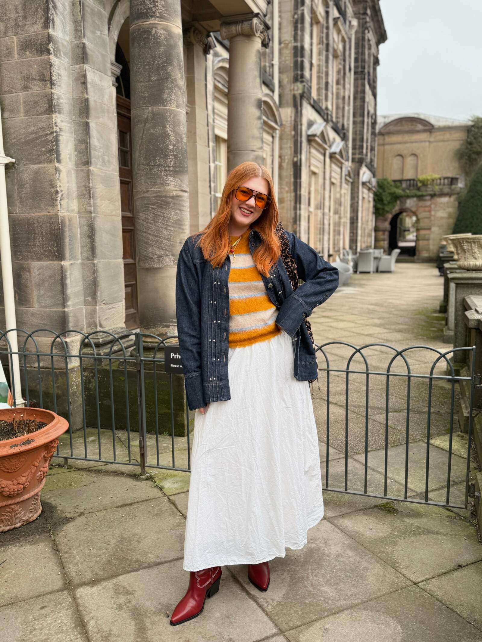 For spring, I’m softening it with lighter fabrics and relaxed staples like these lightweight red denim trousers from Marks & Spencer. This Damson Madder jacket is one of my greatest Vinted finds bar none.